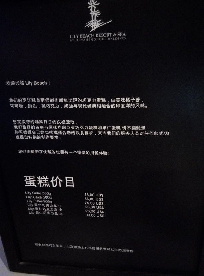莉莉岛有现做的蛋糕,上面是蛋糕价目表。