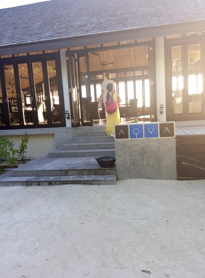 yoko背了一个红色的大包,哈哈。这个就是AQVA酒吧的大门,可以吃午餐的,午餐的营业时间是 马累时间的中午12:00-下午的15:00.酒吧的营业时间是上午的10:00-晚上22:00.