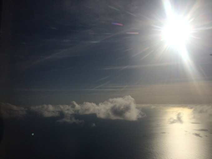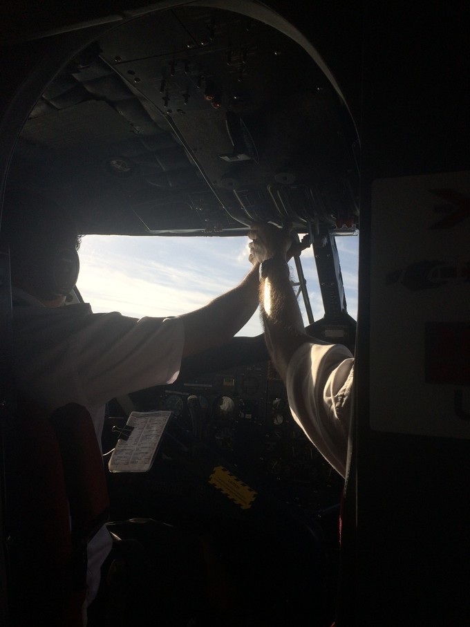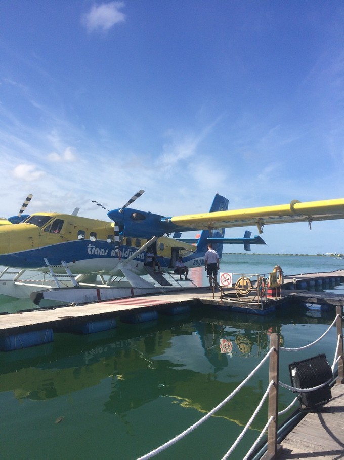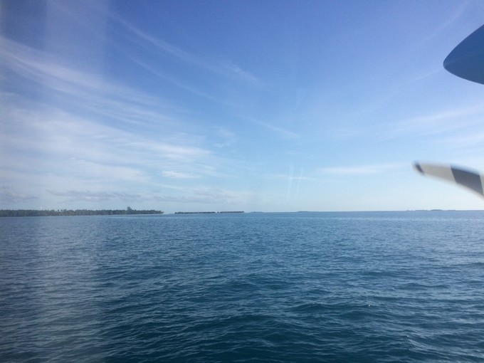 估计副驾驶被看的不好意思了,哈哈。我们坐在水飞的第一排的位置,有一个小风扇,会感觉没有辣么闷热,而且没有螺旋桨挡住视线,不过汽油味真的是蛮重的。声音轰隆轰隆的,起飞的时候声音受不了,太大,耳朵震的....我也没有要耳塞。 水上起飞,真的是蛮震撼的。特别是飞在空中,俯瞰 印度 洋的时候,太美了,才真正理解什么叫大珠小珠落玉盘,什么叫散落在 印度 洋上的珍珠。一个个小岛,美呆了。因为我们上岛是接近傍晚的时候,所以我们是踏着夕阳寻梦。
