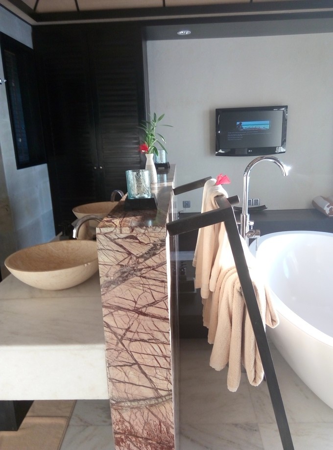 浴室里面是有电视的,边看电视,边泡泡泡浴。泡去一天的疲劳。