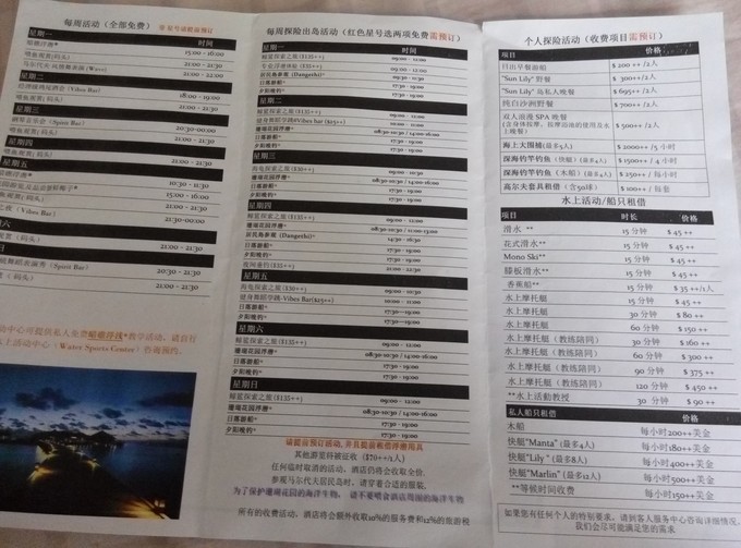 莉莉Lily beach 的一价全包内容。还有岛上的活动项目和价目表。
