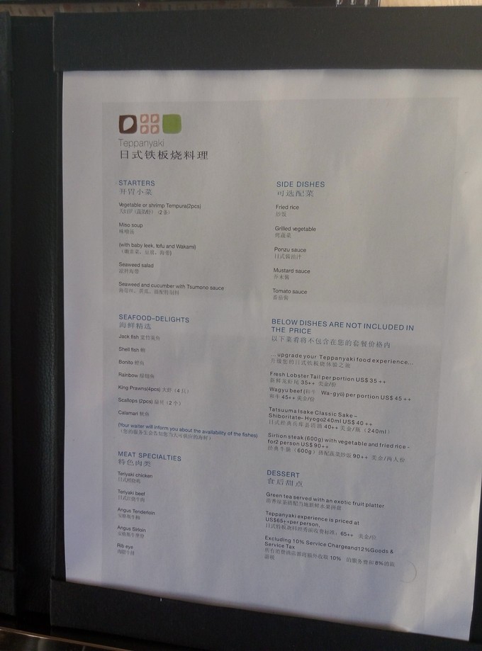 莉莉的特色餐有日式烹饪现场表演,晚餐,每人65美金,时间是19:30-21:30;