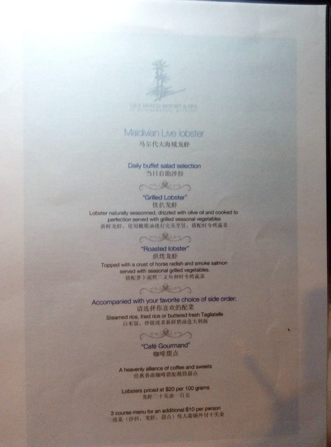 Lily beach 的龙虾之夜菜单,介绍。