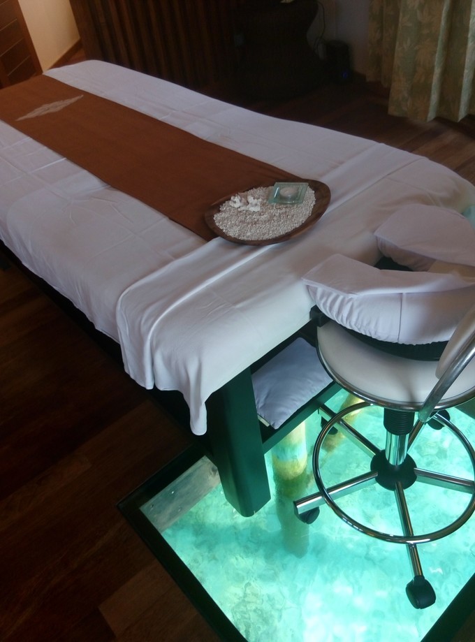 臭美完,开始进入正题了,带大家看看莉莉的SPA馆。莉莉的SPA管是在 水上 的。房间里面有大的玻璃地板,边欣赏大海和鱼群,边做SPA,不要太惬意了!