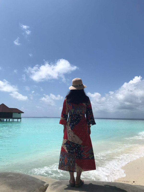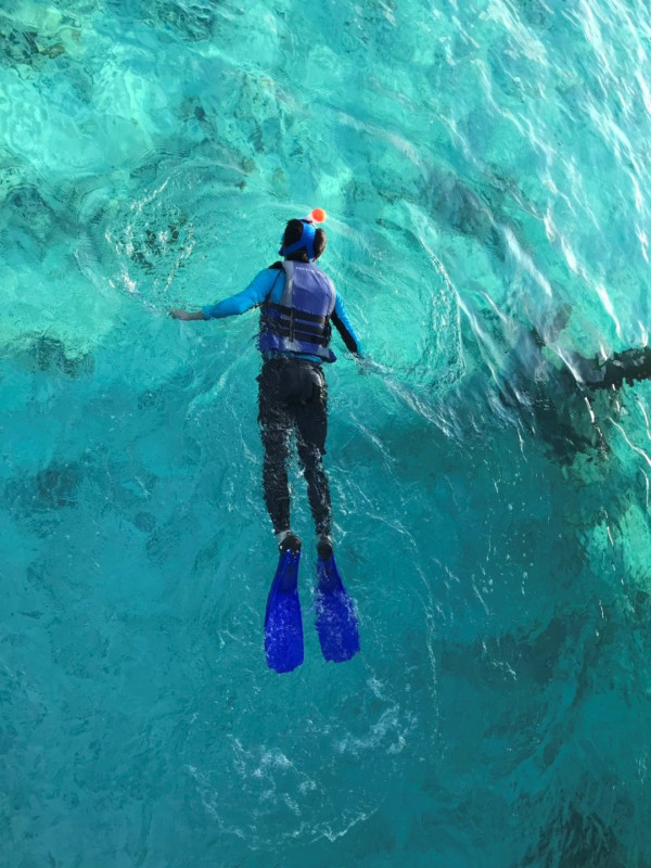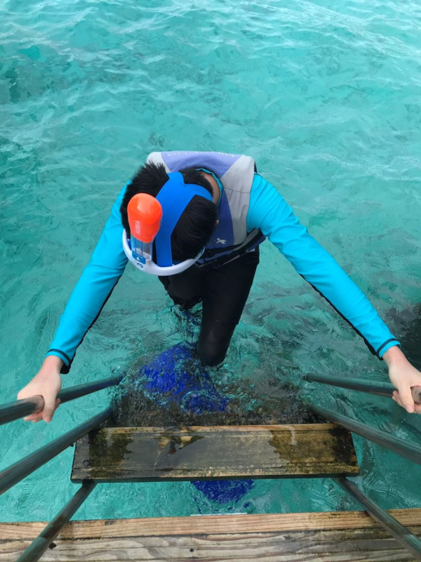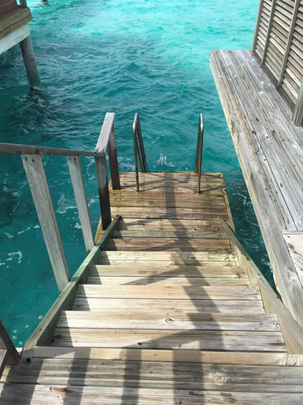 准备开始浮潜起来吧。先是在我们水屋那试了试,风浪特别大,一个浪就把整个头全没过去了,有几次手没抓稳甚至快把人冲跑了,还是挺恐惧的,后来去主码头那浮潜也是特别的怂,抓着扶梯只敢低头,全程就跟把头低下洗脸似的。这时候才发现那些吧嗒吧嗒在海面上浮潜的人是真牛啊。那天风浪很大,基本上草草看了看就算了,内心对海水的恐惧一时难以克服,不过主码头那确实适合浮潜,珊瑚多雨也多。这样第一次浮潜就伴随着恐惧结束了,甚至觉得也不会有第二次浮潜。没成想到了第二天,海面上波澜不惊,虽偶有小浪,但和昨天比起来绝对平静的太多了,毕竟救生衣也是花美刀租的呢,一下还租了两天,实在不忍心用一次就报废了,遂决定在此下水一试,水面算的上很平静了加上昨天已经有了第一次经验,这第二次来的已经不那么吓人了,慢慢的习惯了以后已经敢手抓着扶梯,把身子展开了,又过了一会,就敢把手松开慢慢的在水面上游了。就这样在我们水屋那练习的差不多了,决定再去主码头那试试!来到主码头以后先看了看水面,还是挺平静的,和昨天一样,下去,然后松开手,就这样在海面上划游,那一刻,被海水下面的美景震惊到了,很后悔没搞个水下相机。