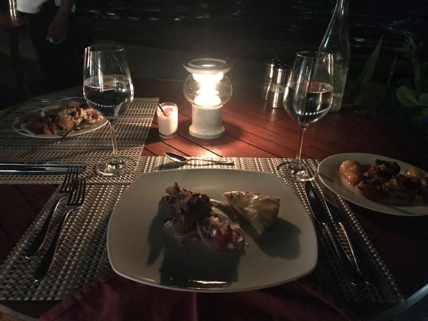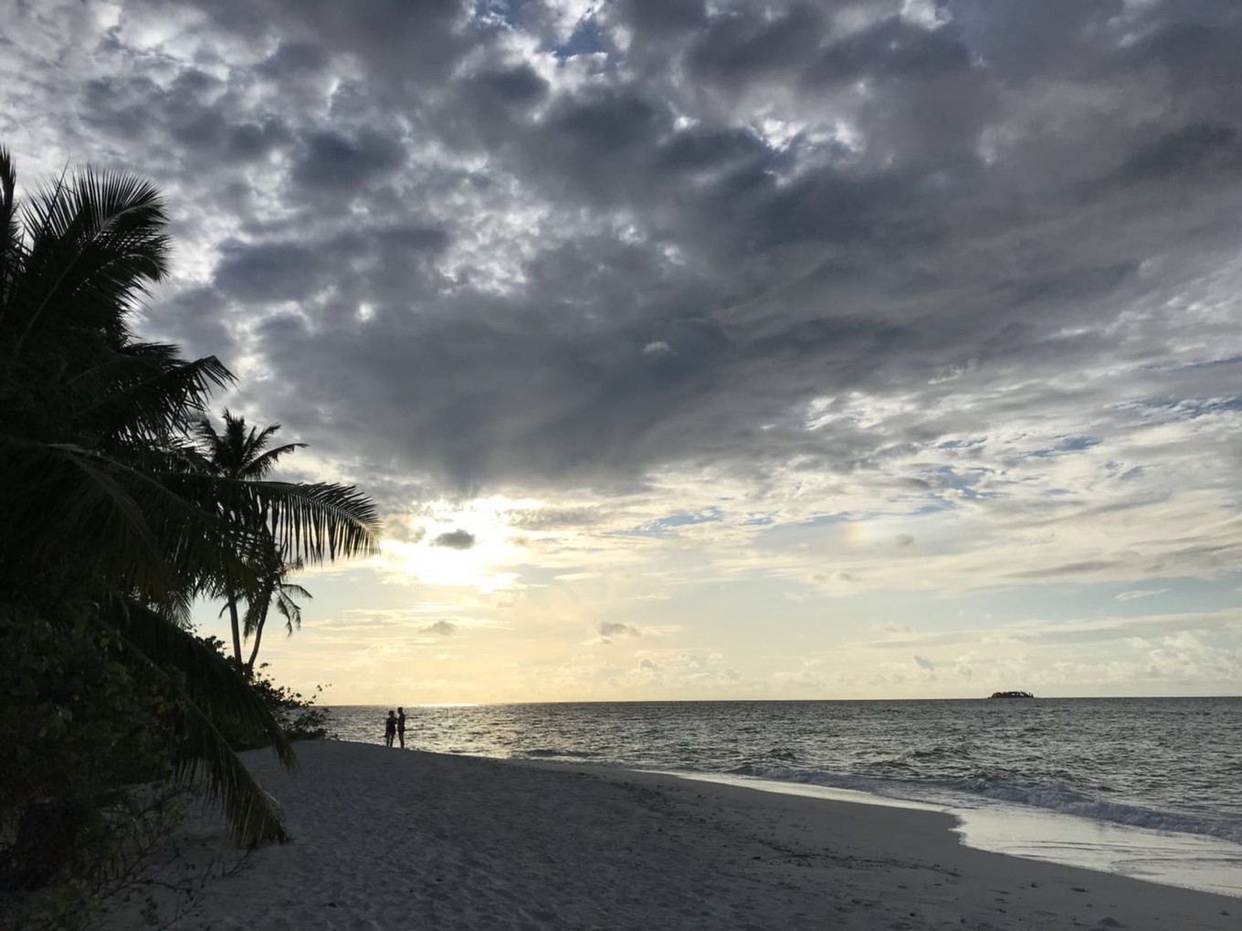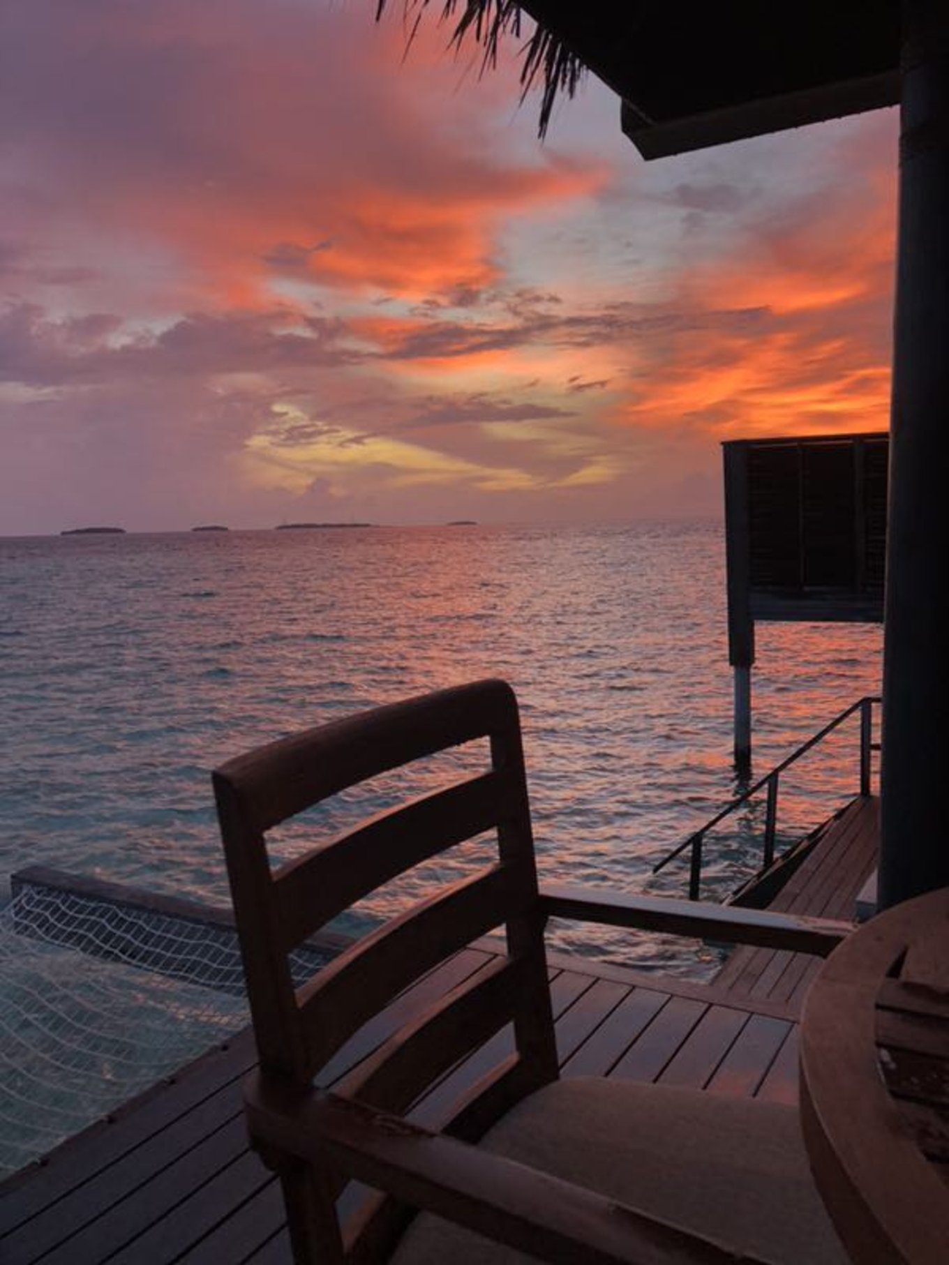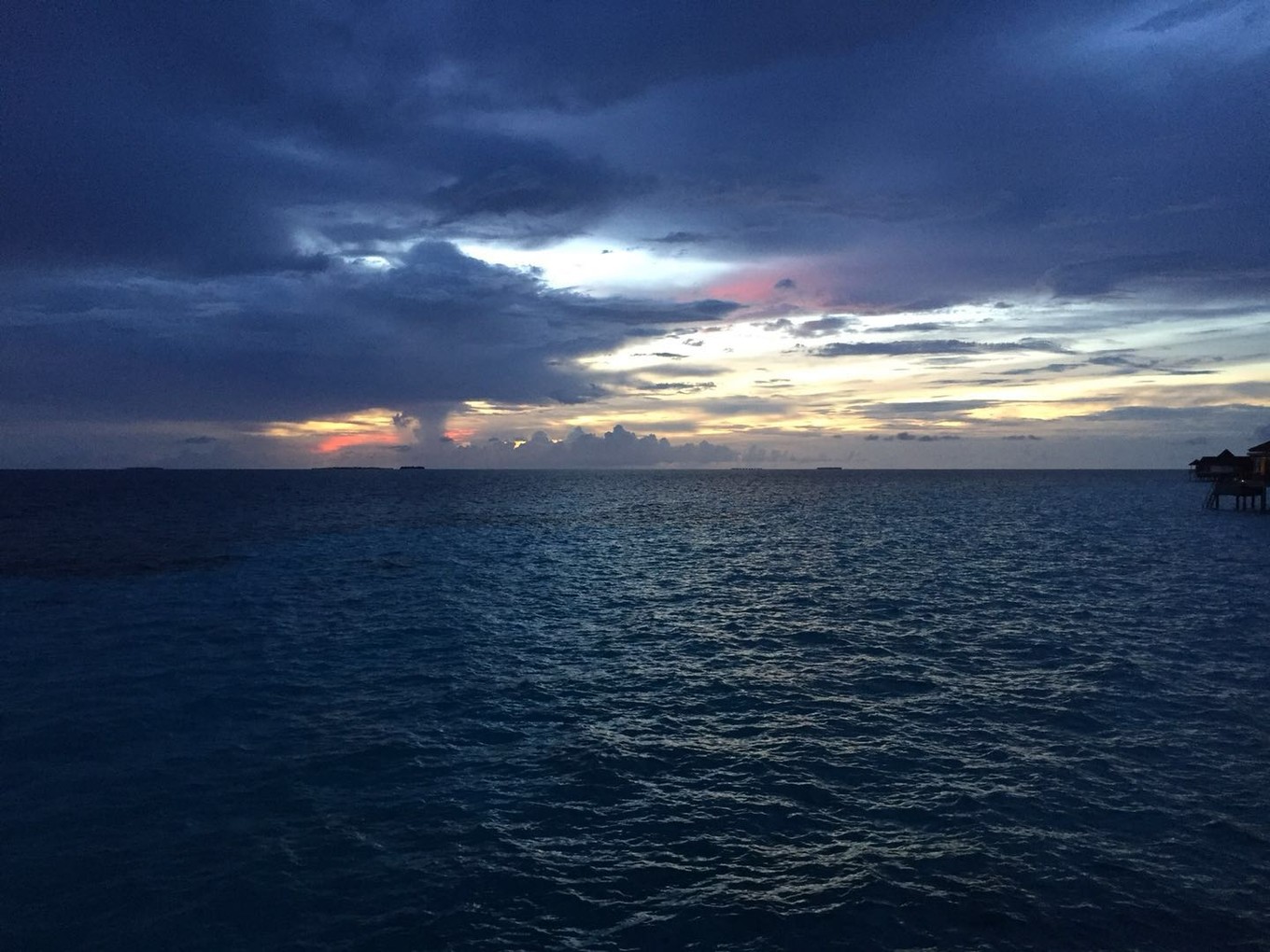 接下来,在经过内飞候机室3个小时等待、1个小时飞行、40分钟快艇颠簸后,我们终于到达了此行的目的地。起飞没多久,太阳就下山了,没有看到"珍珠岛链",看到了日落也算是弥补,我在内心这样安慰自己。到达Kaadedhdhoo岛时已经开始下雨,快艇的在风浪中颠簸,周围黑压压一片,偶尔路过一个小岛,看到灯光,都让我生出一丝踏实感。靠岸时,度假村工作人员已经撑伞在等着迎接我们。可是彼时我们的心情,完全没办法笑出来。人淋湿了,行李淋湿了,饿着肚子,还很困。一个 东北 姑娘接待了我们,帮我们快速办理完入住手续,让工作人员带我们去房间。先睡个好觉,休息够了,明天才可以愉快地玩耍。今夜风平浪静。