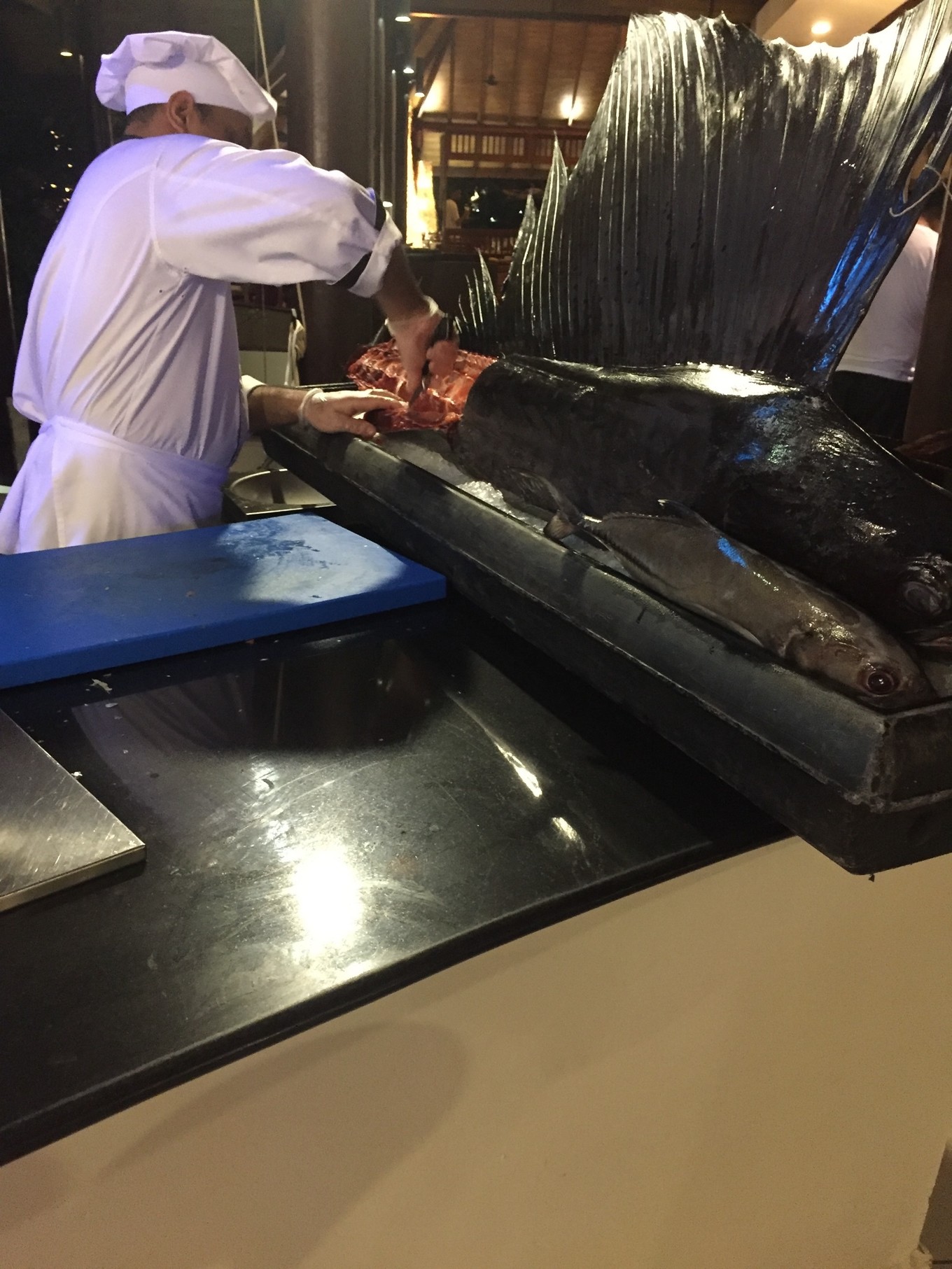罗宾逊的三餐都是自助餐,简单、自在。综合几天下来,早餐基本是固定样式,种类丰富。还有现做的华夫饼、薄饼、omelets,中式、西式、日式,总是能找到合口味的。中餐中规中矩,是三餐中最简单的一餐,我们也从来不敢吃太饱,毕竟下午要下水浮潜。下面要说到晚餐了,惊艳。每晚会换不同的主题。我们错过了到达当晚的red&white party的,很是可惜。第二天是烧烤主题;第三天的晚餐是阿拉伯主题的;第四天晚上有新鲜的现烤牛排、生鱼片、 西班牙 鱿鱼等。当你看到有一整条的金枪鱼躺在那,料理师在旁边,不紧不慢现场制作生鱼片时,怎么能不激动!还有整只烤好的乳猪,现切现吃,脆而不腻。所以去罗宾逊的话,晚上给自己留点肚子,好好品尝不同主题的美食。餐厅的服务员都很热情,会贴心地问候前一晚睡得怎么样,告诉你哪里浮潜更好。他们的工作态度,就像他们的工作服背后印的:we love what we do.