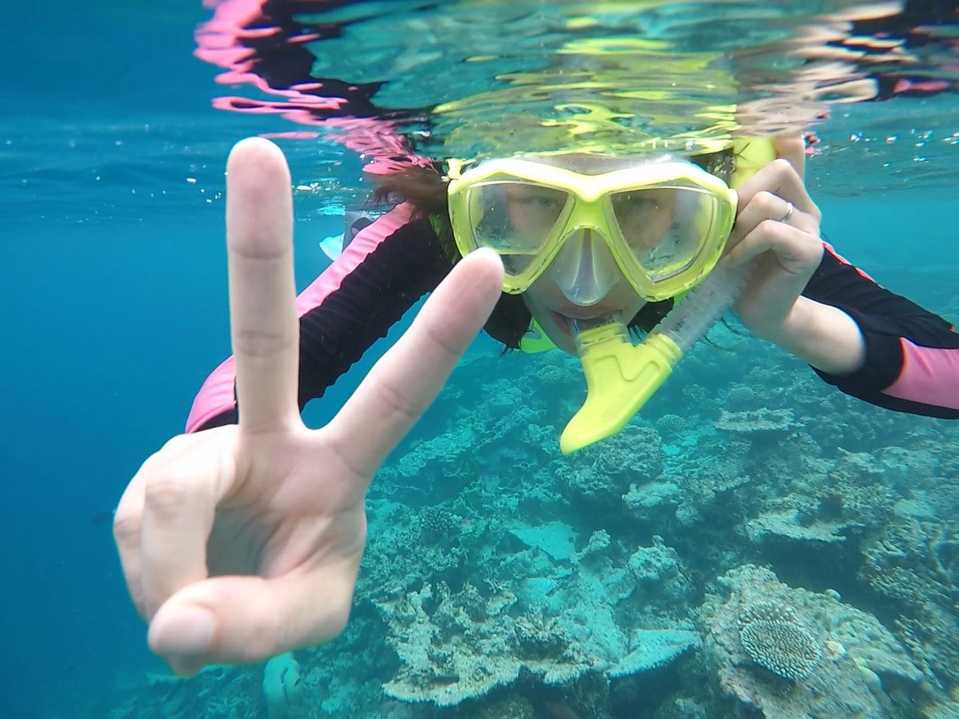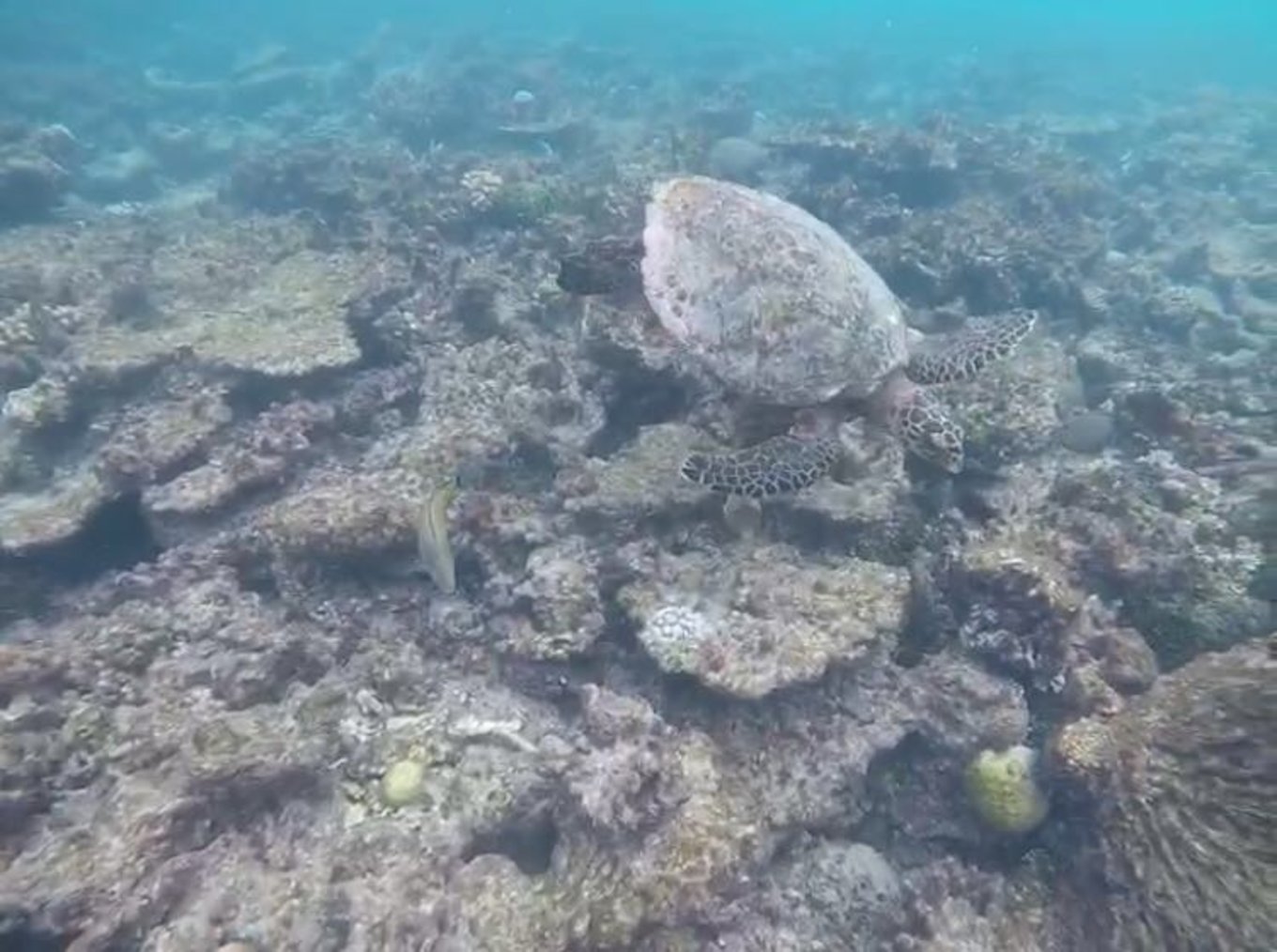 罗宾逊岛为了保护珊瑚礁,不允许随意下海,立有蓝色标杆的才是下水的地方。对着杆子,是已经开辟好的游行路线,这样也可以避免水太浅,而被珊瑚刮伤。游到杆子了,也就离海沟不远了。在珊瑚礁这边可以看到各种各样的鱼,能见度在上午最佳。在靠近码头的水下,我们看到了海龟、鲨鱼还有可爱的尼莫。天哪,看到海龟在我眼前那一刻,我简直要开心地晕过去,太可爱了。小家伙一点都不怕人,还朝我游近点,我怕伤害到它,不停地远离。可是因为全球气温上升,即使在马代,珊瑚的白化都日趋严重,这是让人心痛的。当你往外游一点,就可以看到断层,浅色的海水和深色的海水在这里交汇。海水深不见底,时不时有鱼群经过,很是壮观。不同的浮潜点看到的生物是不同的,相同的浮潜点在不同时间看到的生物也是不同的。现在就恨自己没有多学习点海洋生物知识,眼中看到的却不知道它们的名字。