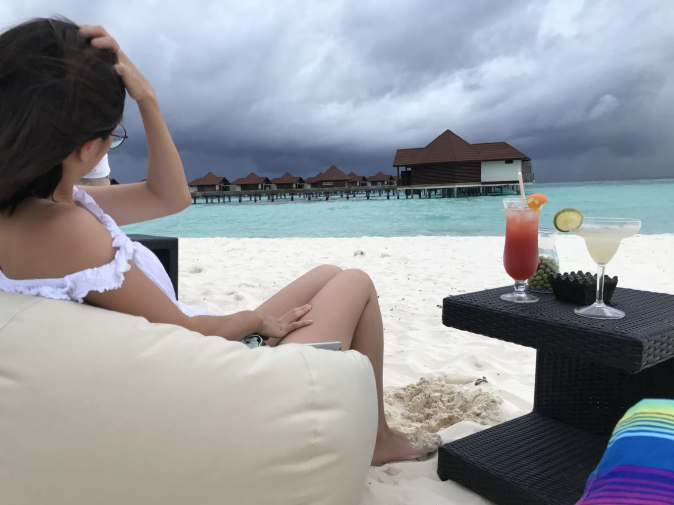 之后住的礁湖别墅,整体设施都比沙屋要新一点,房间也挺宽敞,传说中的玻璃地板,下面偶有细细的镰刀状的鱼群游过。卧室的大床正对着一面落地窗,取个靠枕垫在脑后,就可以边在床上摊着,边欣赏海景了。最吸引我的是那个外面的大床,真的可以躺在上面一整天,然后静静等待日落。