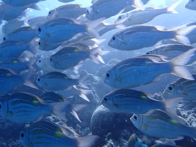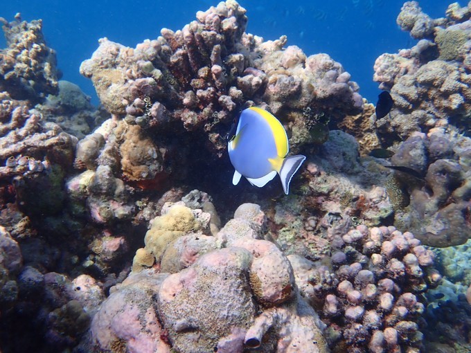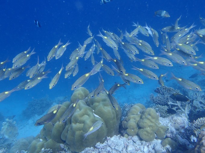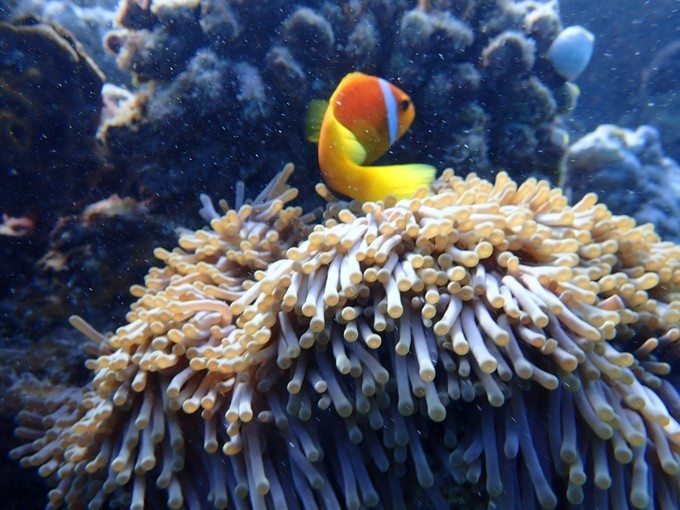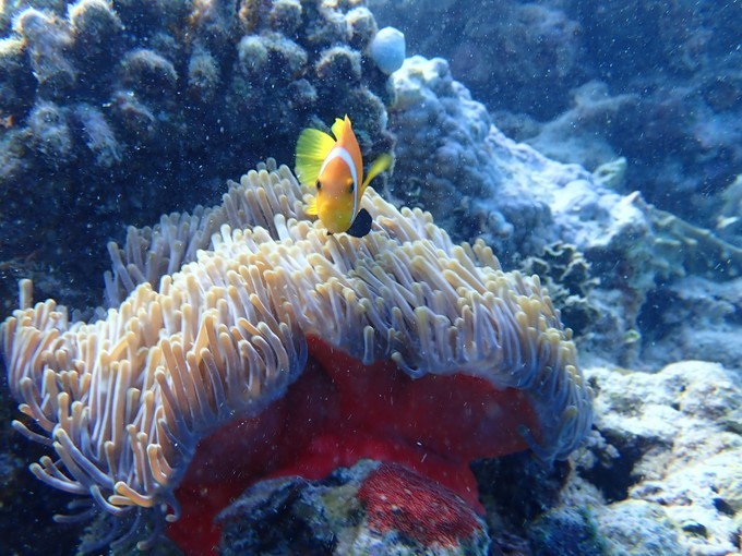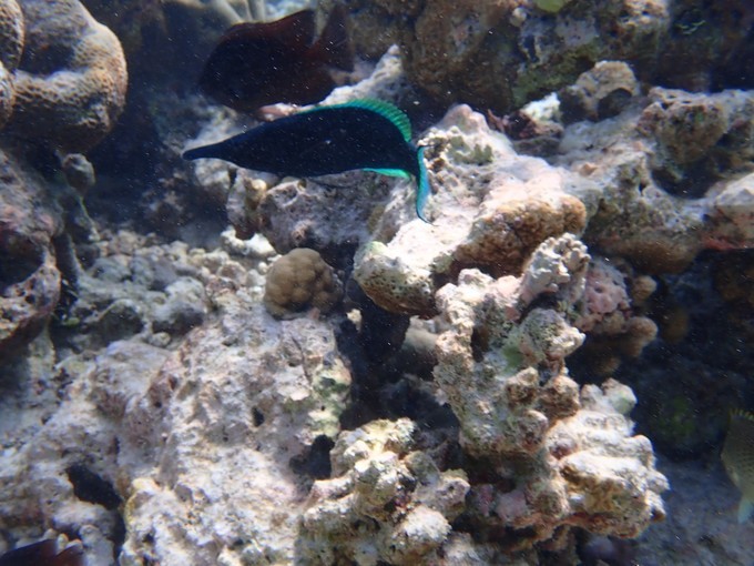 们在水屋下面浮潜,自己带了浮潜的用具,这里的水是如此清澈,有句名言说,:水至清则无鱼,此时此景依我看是,水至清则有鱼,。穿着救生衣带着泳圈,把头伸在水下,看见各种各样的五颜六色的小鱼自由自在的游来游去,第一次与鱼儿们如此近距离的接触,那种感觉很奇妙也很美好!