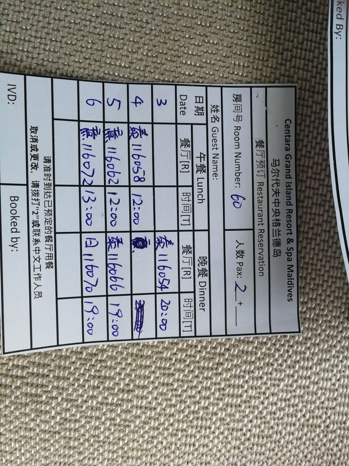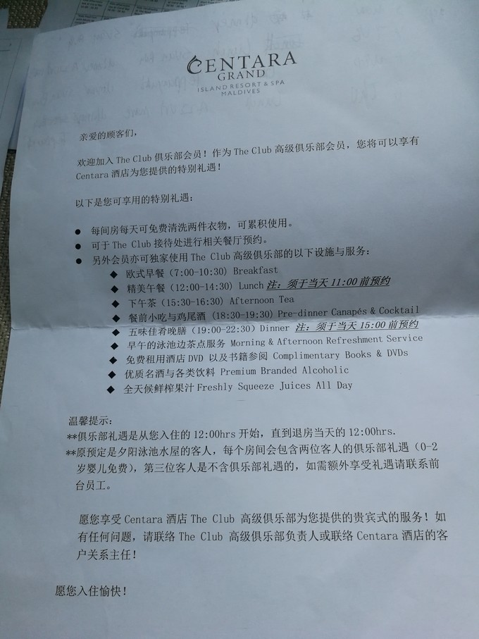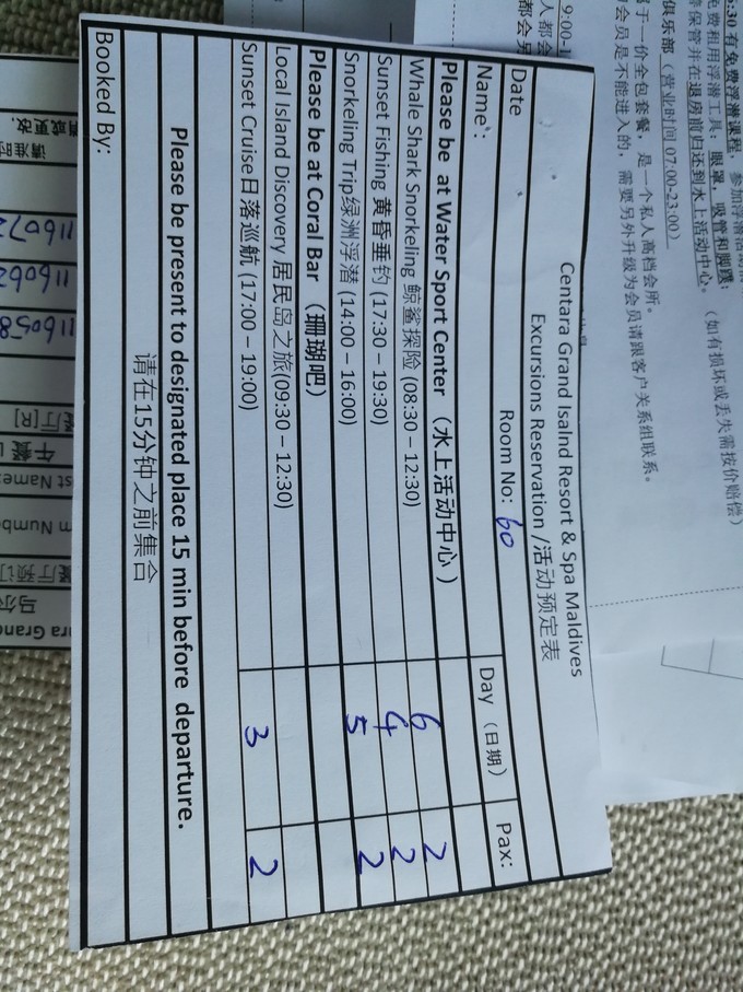 登岛后会有中文工作人员帮忙填写入住的单子,上岛后如有需要可以在水吧点饮品这时候就已经全包喽不需要额外付费。然后就把餐厅还有赠送的活动都预约了