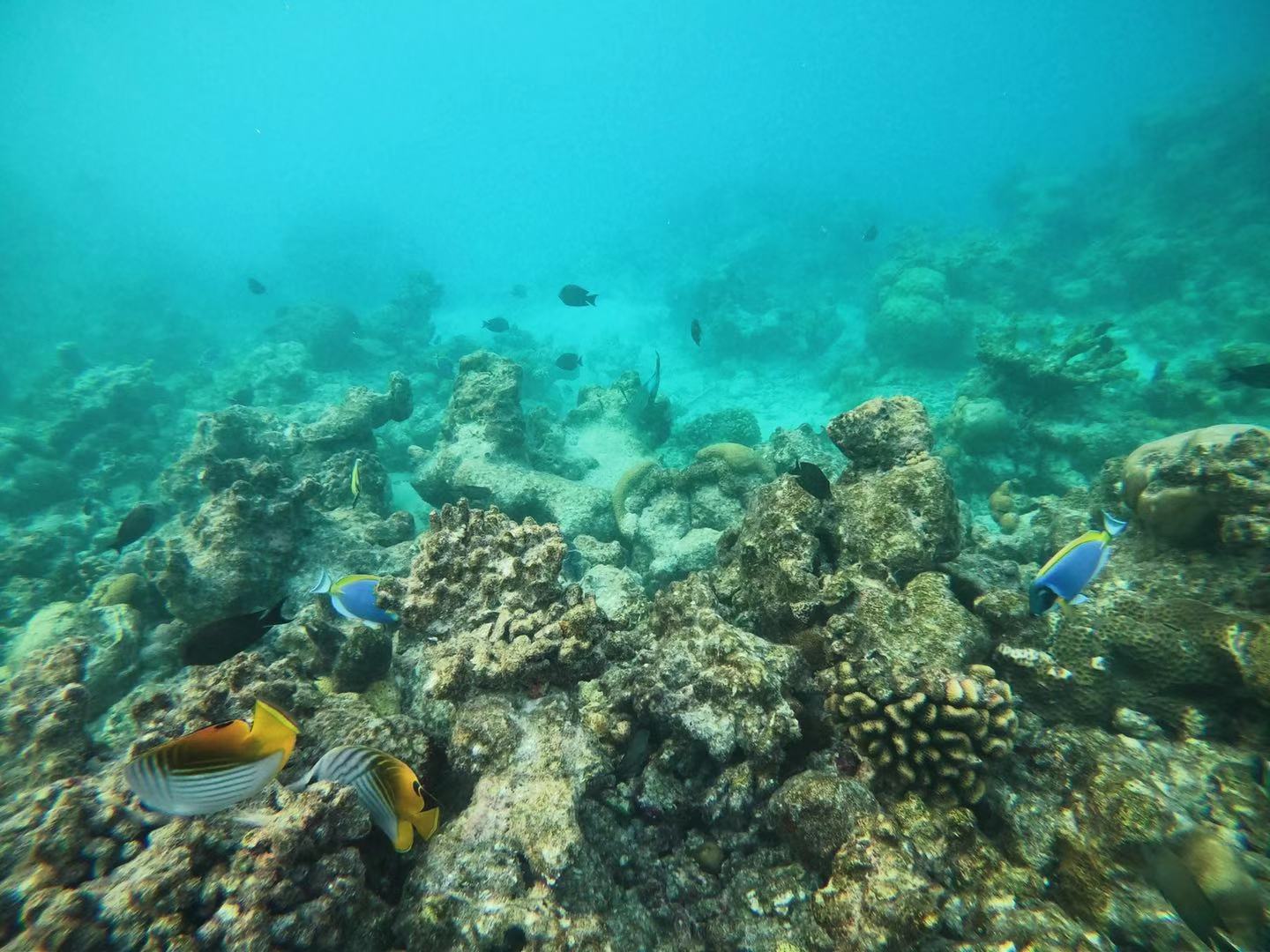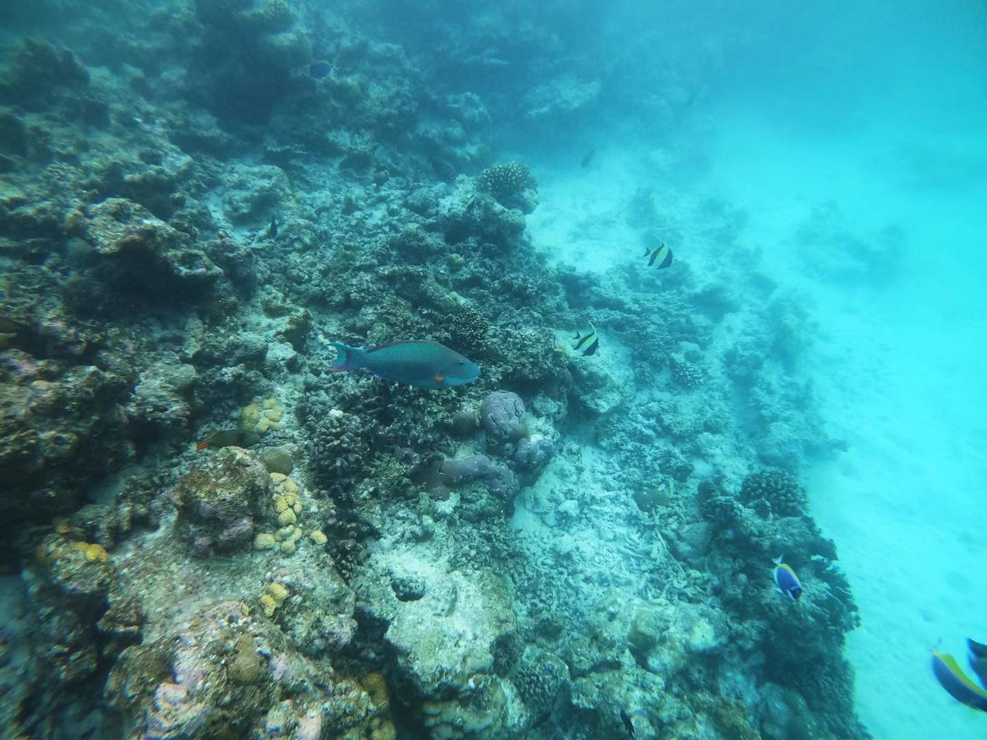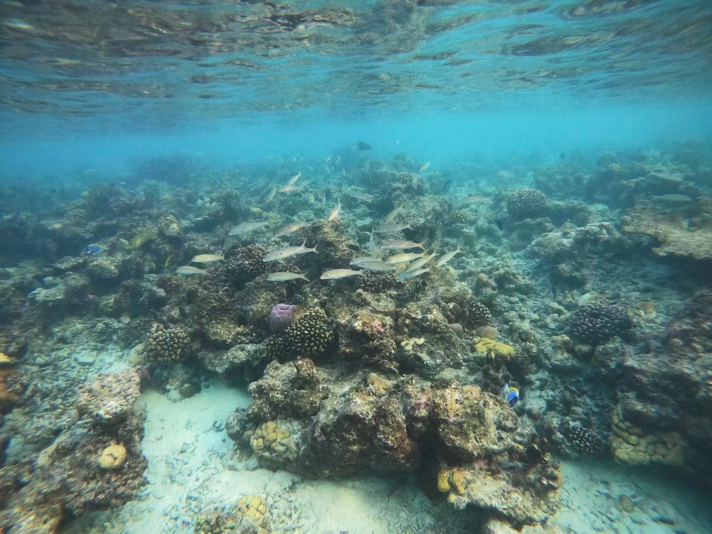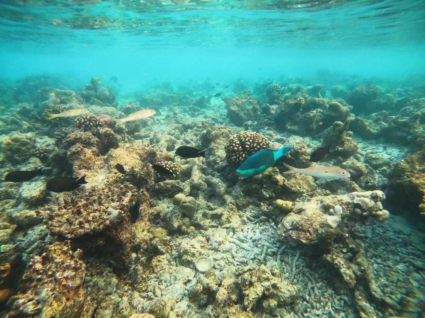 稍置休息,我们便迫不及待的下海浮潜了。 奥露岛 的浮潜条件确实比之后的奥静岛更美好。因为沙子没有那么细腻,所以水格外的清澈。在水下,可以看到成群的鱼儿游来游去,有色彩斑斓如同穿着美丽盛装的热带鱼,也有身体如同透明的不知名的鱼儿。浮潜让你有一种与鱼共舞的美丽感觉,文字着实难以描述。直接上图吧。