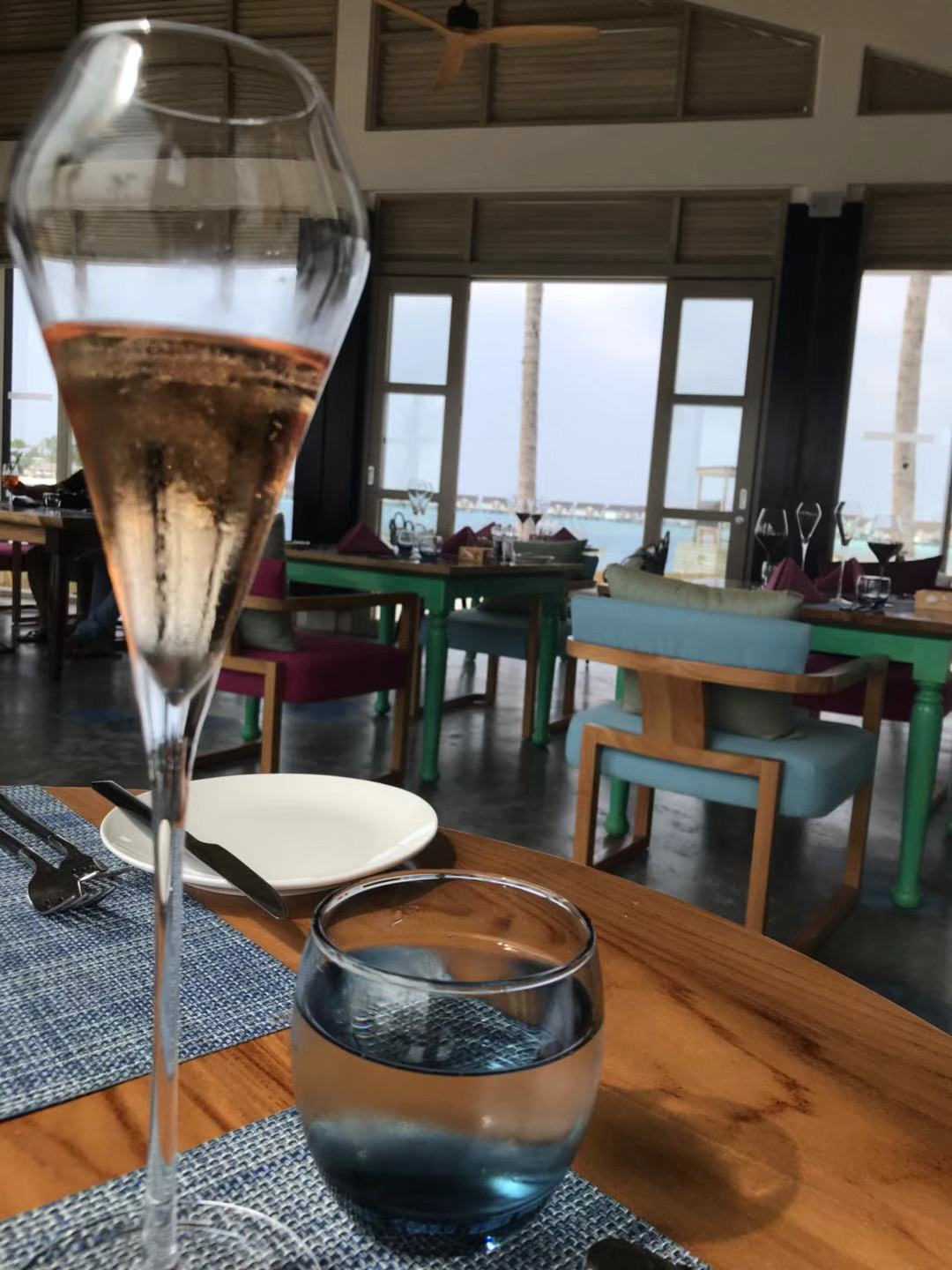 中午我们乘坐着安排的快艇,乘风破浪前往了我们的第一个岛屿, 奥露岛 。这里我们是两晚的海滩别墅。一登岸,就是酒店人员热情的拍鼓演奏。干净的湿毛巾在第一时刻便递了上来,配上蓝色的香槟,让我们被太阳晒得火热的身躯和内心 都安 静了下来。