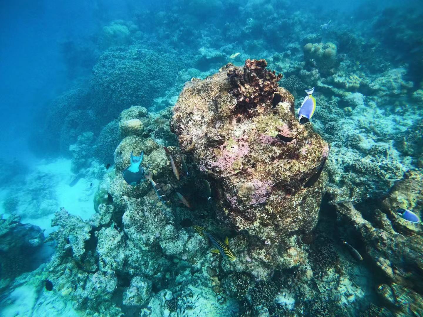 房间的地板上有一处是透明的玻璃,可以透过玻璃看到清澈的海。我们的屋子貌似是一只蓝色的烟管鱼的固定住处,总是可以看到它懒洋洋的浮在 水里 。浮潜的美丽就不多加描述啦,只是在泳池酒吧对面的那片海,不仅仅可以浮潜,因为那处的稍微深一点的地方,有一个徒然出现的陡坡,可以体验深海漫步的美妙。对了,比小腿还要粗的海参,硕大的海胆,奇特的大头河豚,小鲨鱼,都是难以忘记的瞬间。