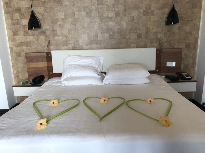 (三)上岛之路。我们到 马累 是晚上了,直接去了代理帮定的机场岛中转酒店,并被幸运的安排了第二天早上六点出发坐水飞上岛。第二天经历汽车-水飞-快艇后,我们大概中午12点半,终于到达了坎多卢,一下快艇,酒店经理和GO们都笑脸盈盈。