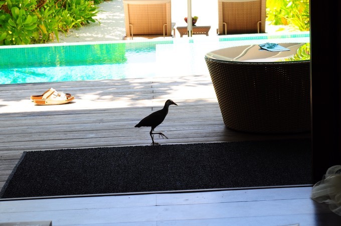 真正的岛主大人,每天早上六七点多在泳池沙门口的海滩上喝水,每天傍晚时分在泳池沙海上的珊瑚礁上伫立。