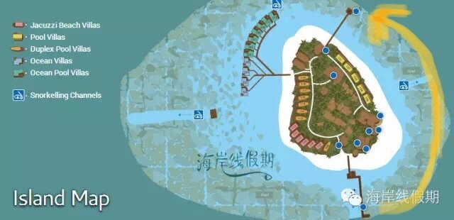 我标注的黄色箭头区域为水上中心为我们指示出的浮潜最佳区域。