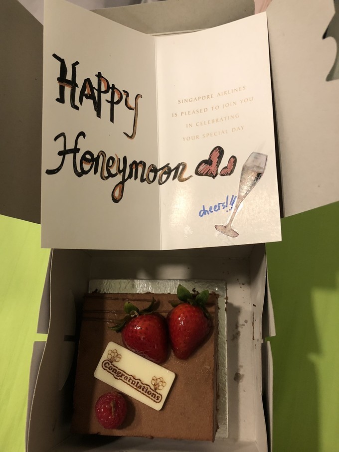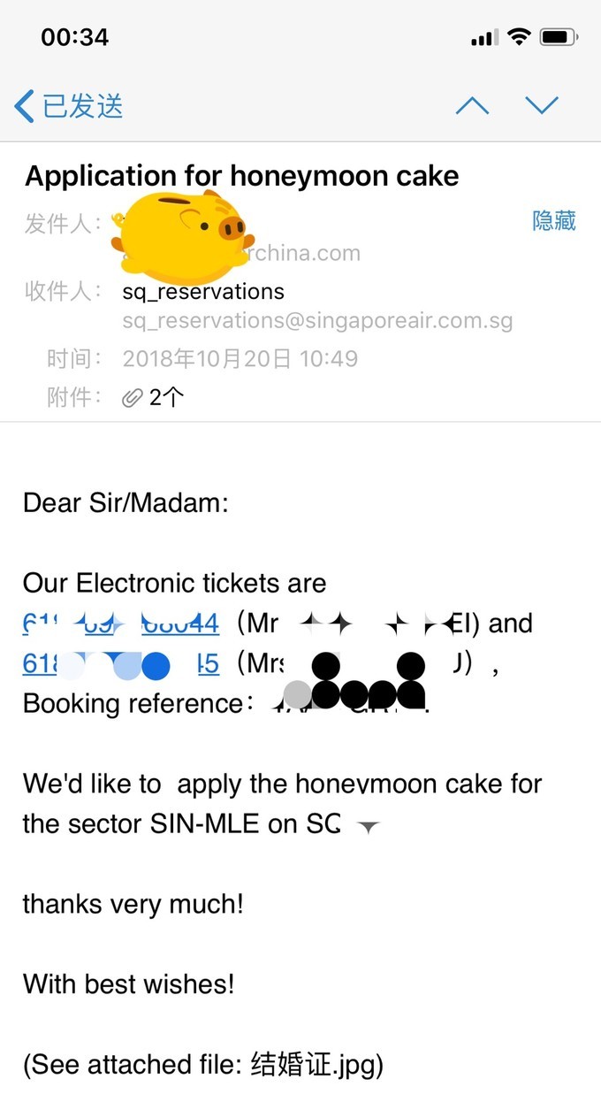 (一)申请蜜月蛋糕。 重庆 飞麻袋是先胜安航空到 新加坡 ,再转机新航到 马累 。如果是代理订的机票就找代理帮忙申请就行,由于我们是自己在去哪儿订的机票,蜜月蛋糕就发邮件申请了。附上收件箱和内容模板供参考,新航效率高,几个工作日就回复确定了。到了飞机上也不用再提示,空姐就 会安排好蜜月蛋糕,在 新加坡 飞 马累 这段送上来,味道很棒。