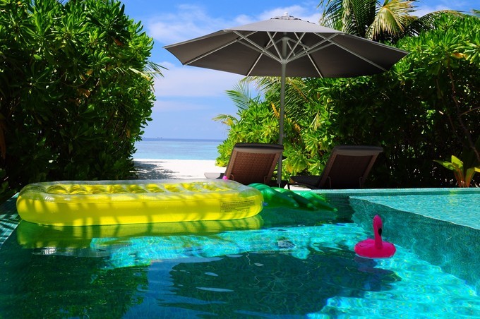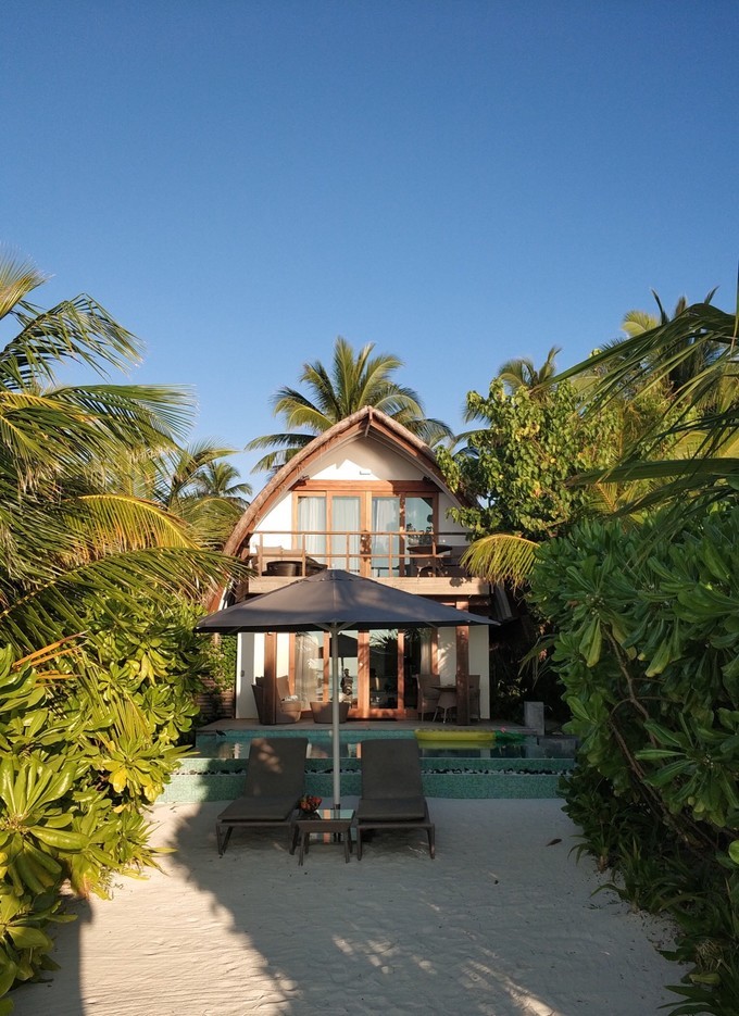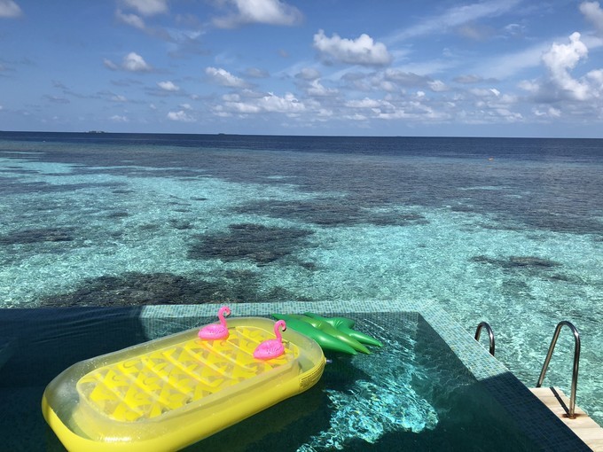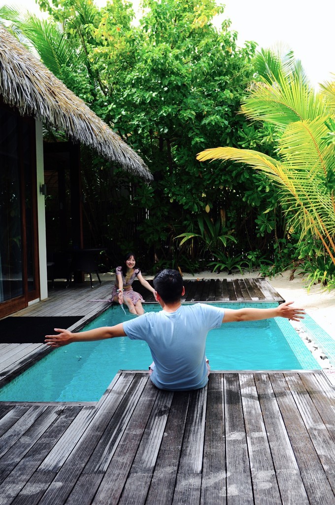 (四)幸运升级。GO接到我们后,我们被通知酒店将我们的普通沙屋免费升级成两晚双层沙屋,把两个妈妈的普通沙屋免费升级成了两晚泳池沙,简直不要太太太幸福!接下来的几天,几乎没有下一天雨,就最后一天准备离开的凌晨狂风暴雨,也在早上停了,简直不要运气太好!再加上最后离岛时间被安排在了下午四点半最晚一班,足足多了大半天的时间玩吃逛拍,上天qio实待我们不薄呐!导致我回来给大家疯狂安利坎多卢
