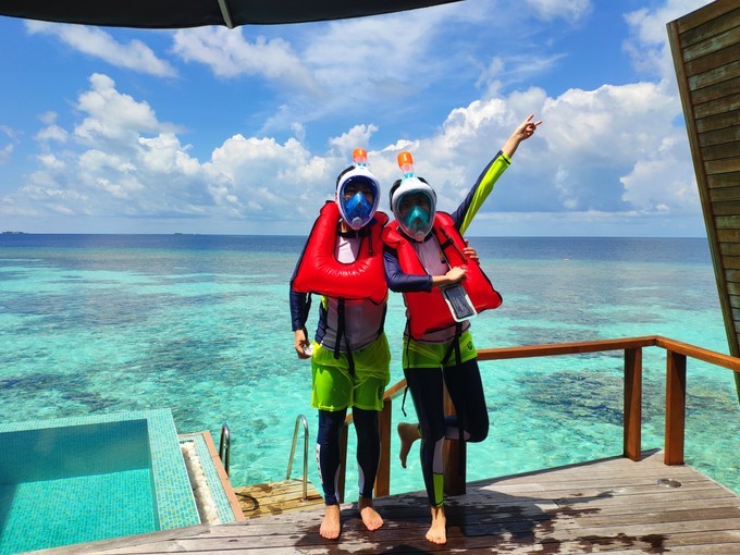 (三)浮潜装备。为筹备此行另一大重头戏------浮潜,我们前往迪卡侬采购了全干浮潜面罩,在网上下单了长袖长裤泳衣,并提前攻略好发现坎多卢给每个房间都配备了gopro5,就省去了这块预算,愉快地准备出发。