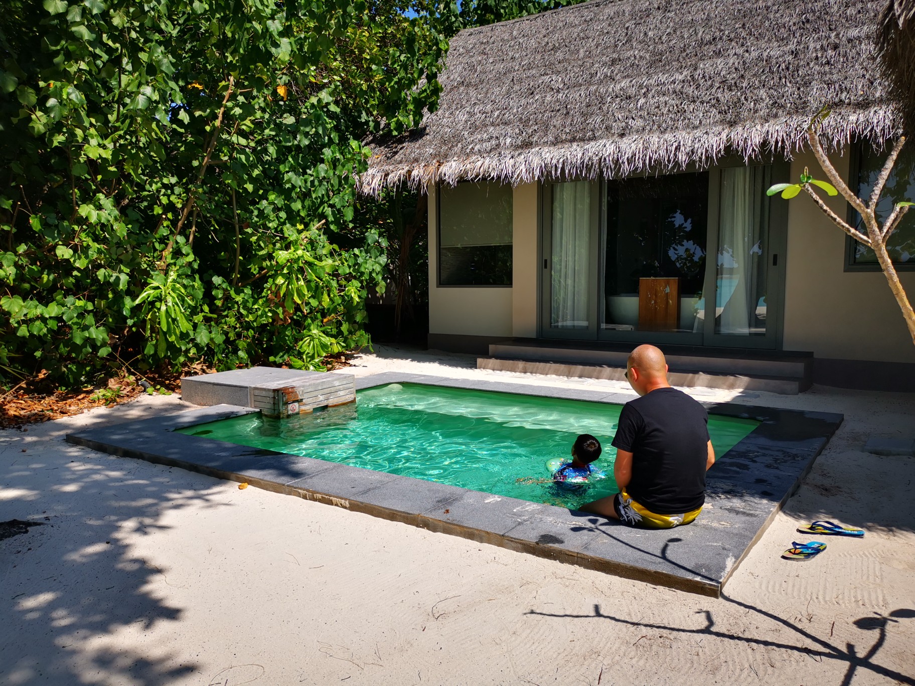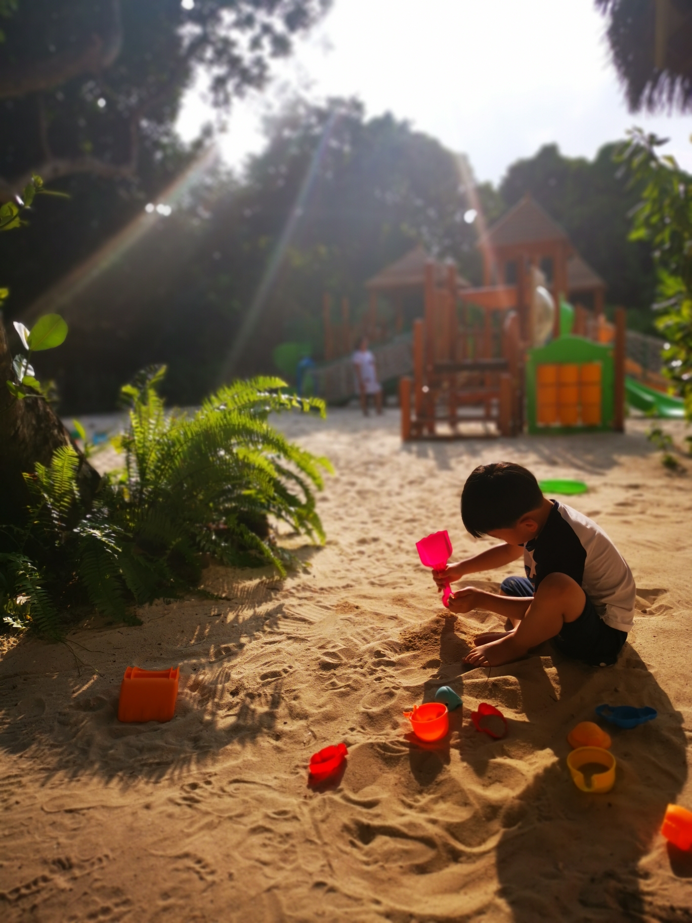 小朋友只要有沙有水就会玩的开心,所以当时定房间的时候就一定要带泳池的房间,这样我也比较轻松,一边看着他们玩耍一边做工作方案,岁月静好