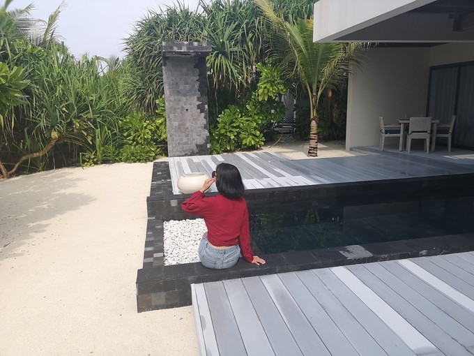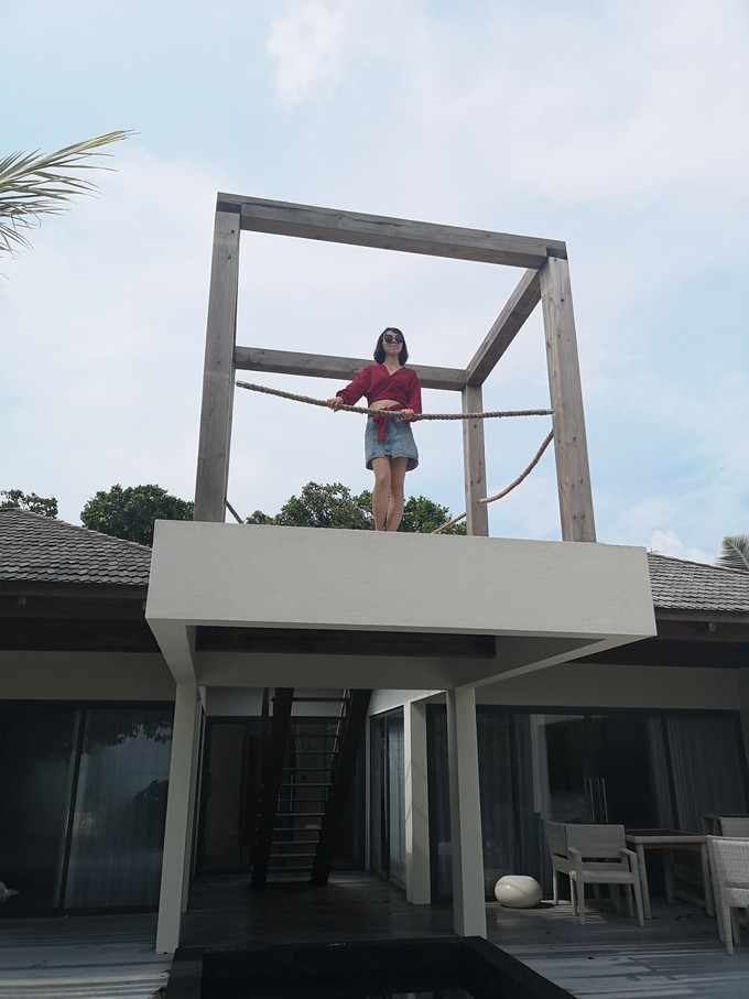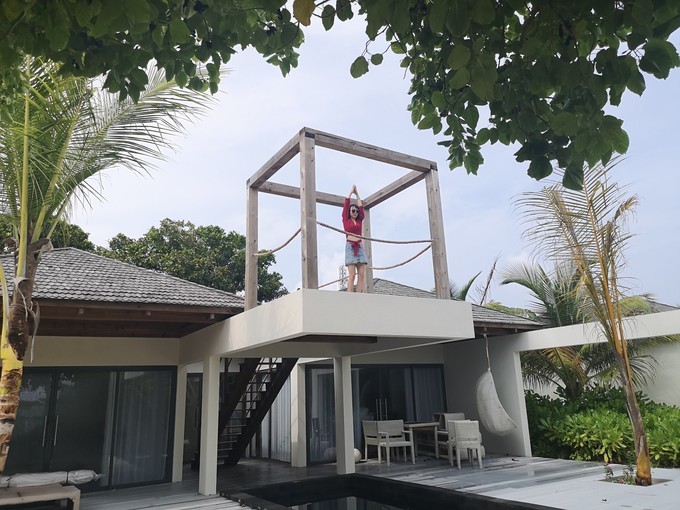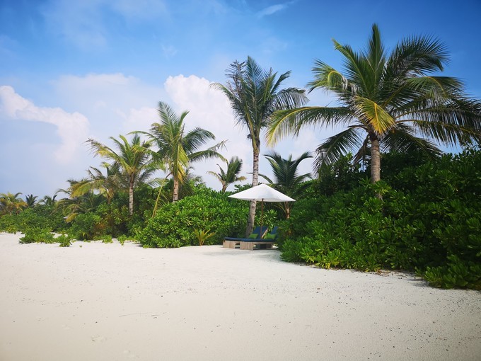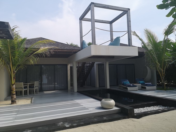 沙屋基本上都是围绕酒店建了一圈,我个人感觉位置都还可以,特别是靠近水屋的沙屋前面的沙滩面积也其实挺大的。然后如图所示,沙屋是有一个延伸上去的一个小平台,可以看看日出日落,可以在上面吹吹海风,晒晒太阳。