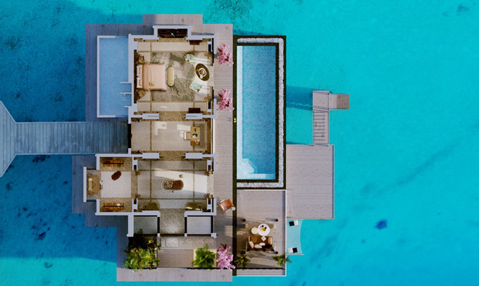 这次入住的是房号是:53号。入住的是豪华水上泳池别墅--Luxury Water Villa With Pool,日出侧。