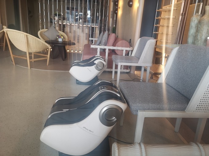 休息室的环境,我个人感觉也是非常舒适的,而且还有按摩脚的,然后苹果电脑,然后吃的各方面都配备齐全