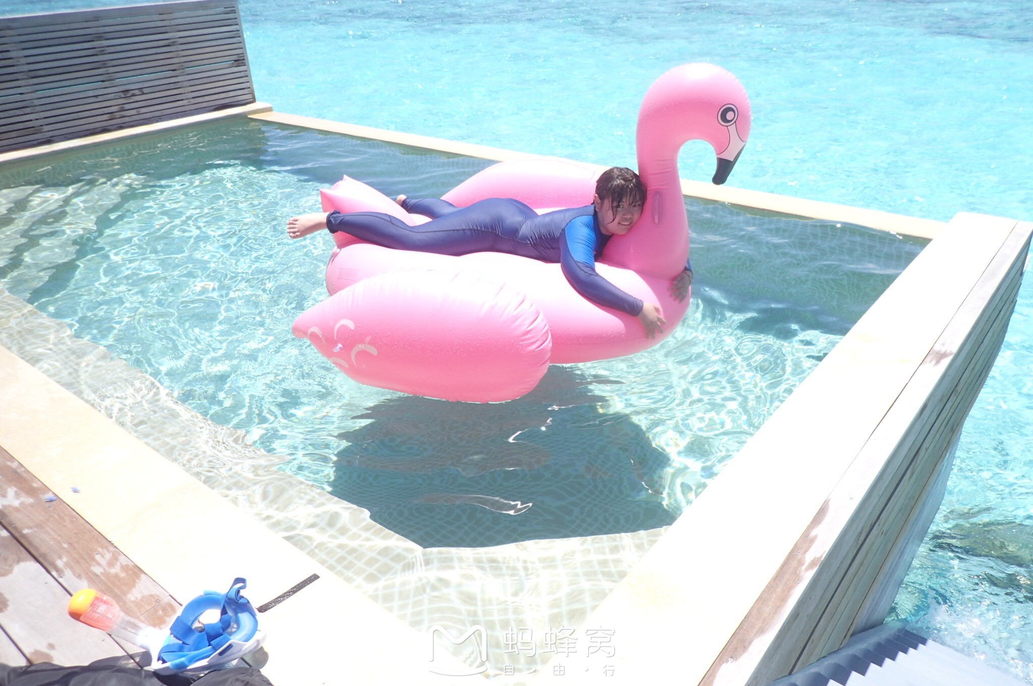 芙拉瓦丽岛度假村浙江这对小夫妻人超好的,不但泳池随便玩还借粉天鹅给我们拍照哦~只可惜这只天鹅最后被大风吹跑了 浮潜的地点还是水屋附近最好,第一天我们不太懂,绕着水屋走了半圈都没看到半个鱼,其实真正看鱼要到珊瑚群里去看的,水屋深处有大片珊瑚,鱼的种类也很丰富。但是水屋附近水偏深,对于不会游泳的人来说还是比较吃力。我发现了一个好地方就是在SPA屋附近,那里也有一大片珊瑚群而且平均水位要低很多,就到腰部附近,很适合初学者浮潜。就是鱼的种类少一点,但是肯定能看到鱼。