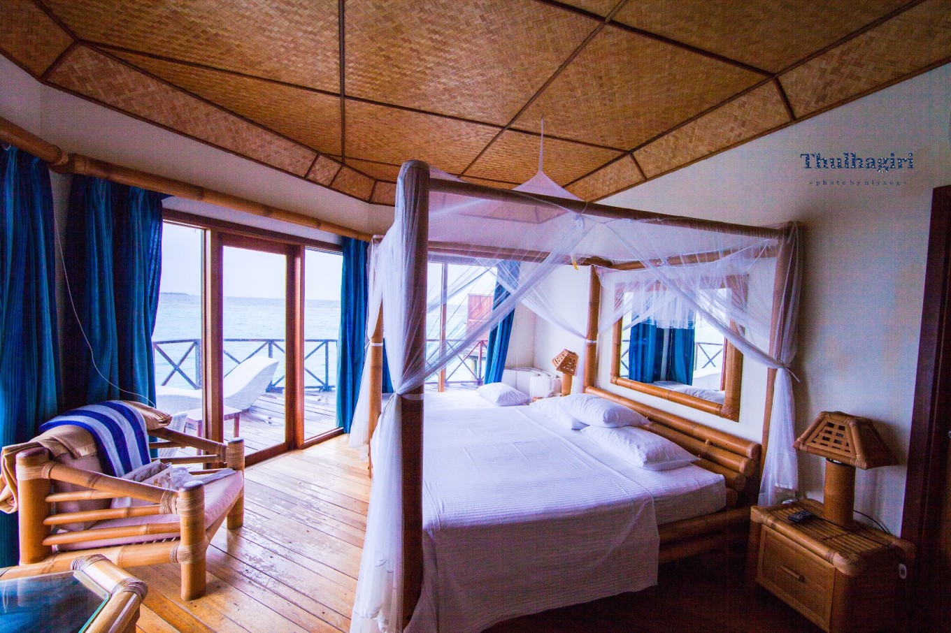 蓝色美人蕉岛全岛共有31间 每间57平米 其中201是最靠近岛屿 217是最远离岛屿 可以看到更多鱼 201~204可以在阳台看日落 214~217可以在阳台看日出 电器及设施相对比较简单