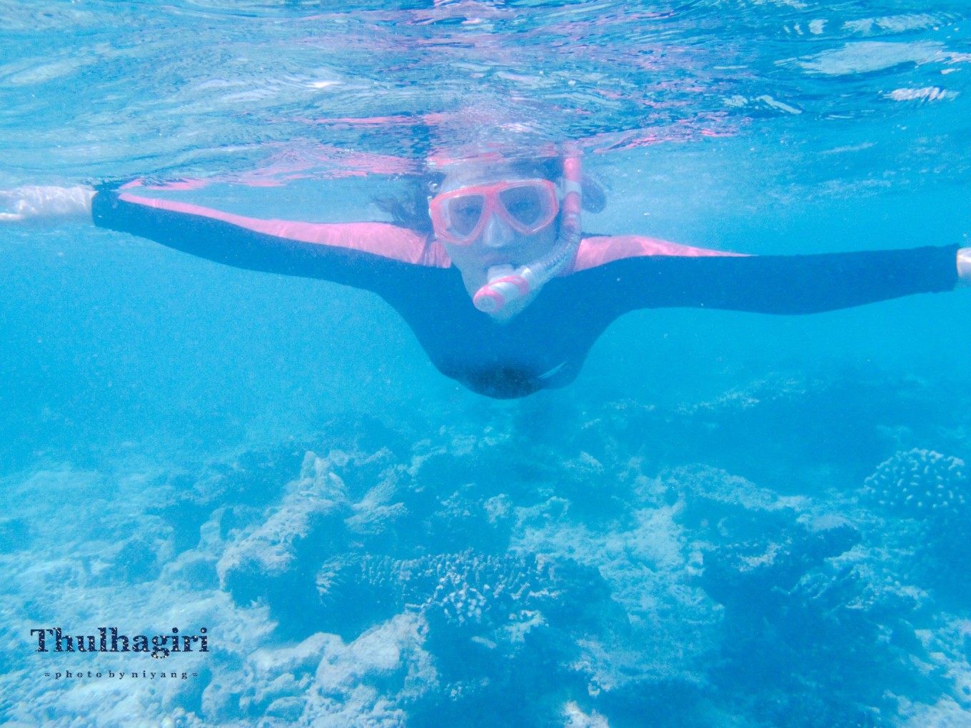 要小心 深海和浅海不同 有相当的危险性 最好是穿着救生衣浮力衣之类的装备去那里 马尔代夫的地形特殊 一个个岛屿就像是从海里长上来的蘑菇 只有个蘑菇顶露在海面上 所以深海和浅海的交界处水的颜色分开的非常明显 这也表示再往前就是直通到底的深海 没有任何坡度....