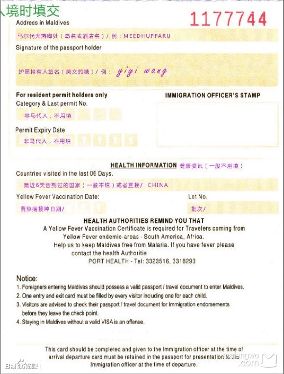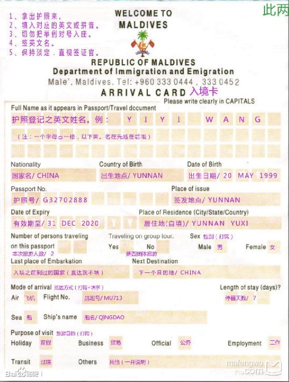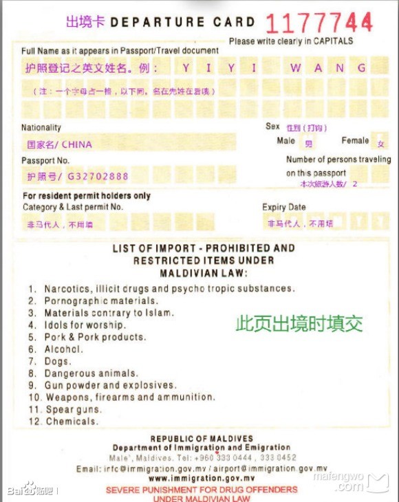 预定好了酒店机票,那么目的地的签证政策必须了解: 出国旅游,准备护照和签证自然是第一要务。马尔代夫对世界上大多数国家实行免费的落地签政策,中国公民只需持有效期在半年以上的护照,即可在马累国际机场办理免费落地签,飞机上乘务员会提供落地签出入境卡,认真填写即可。提供一下中英文对照图片: