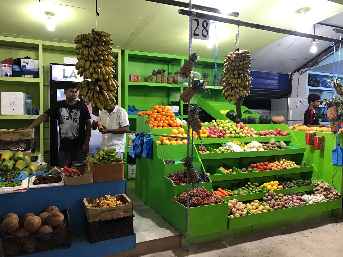 回程: 由于我们是10月4号早上9点多的飞机,酒店安排我们提前一天15点45从酒店出发,仍然需要先乘快艇,再做国内飞机,然而这次乘坐快艇的过程并不美丽,因为风浪太大了,感觉船硬生生的拍在水面上,经过基础颠簸和失重后,感觉胃都要颠出来了。到马累机场后酒店也会帮忙安排下一步行程,无论是去乘回程飞机还是去过渡酒店。 我们到了noomoo已经6点了,而且下着雨,就没有办法再去马累了,就在葫芦马累转了一圈,有一丝丝的小遗憾。在一家当地餐馆吃了晚饭,买了一点水果,当地消费并不低,一个炒饭+一碗海鲜汤(感觉就是三鲜方便面)要10刀,买了两个椰子(3刀)和一个释迦(2刀)。
