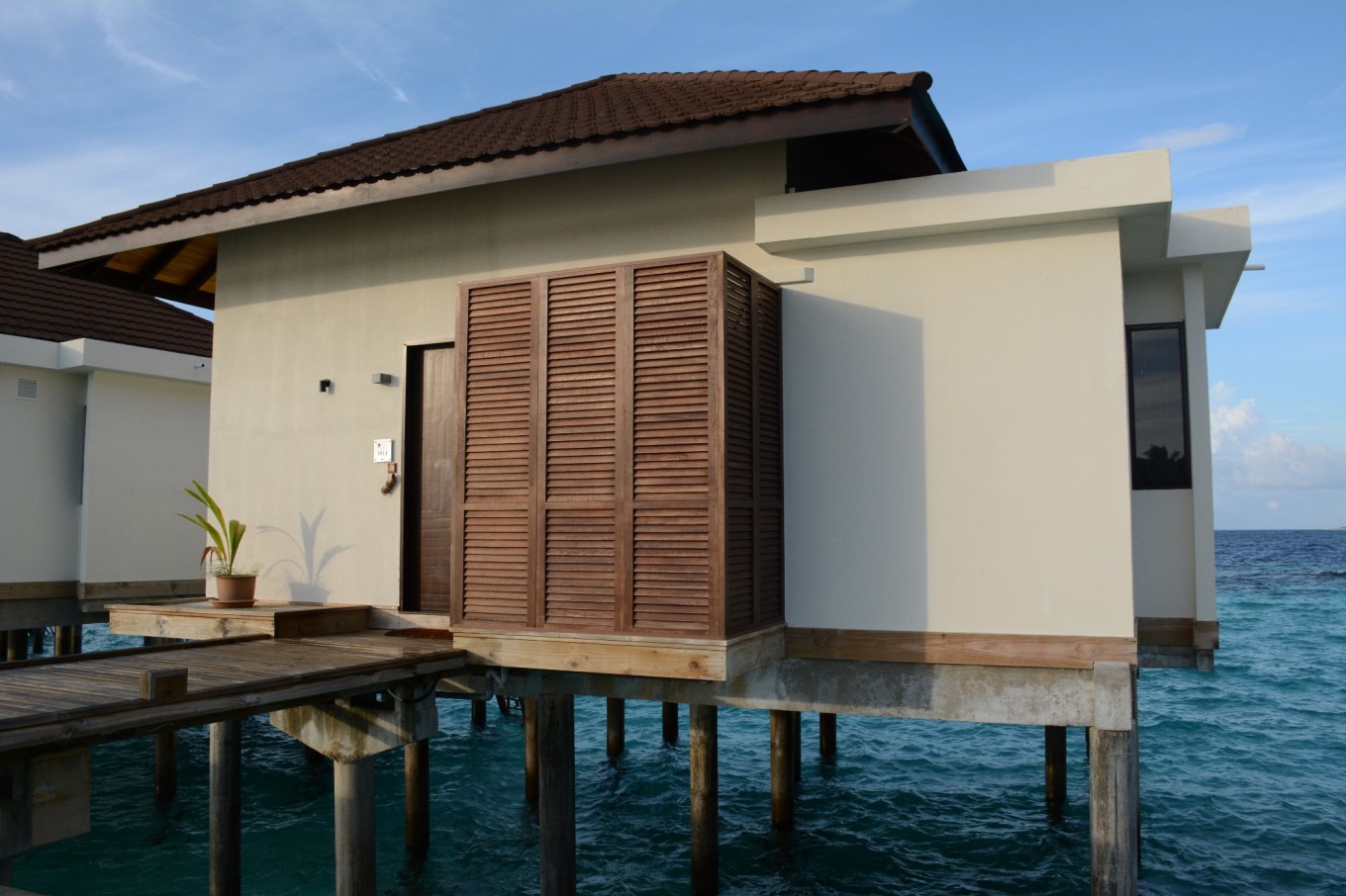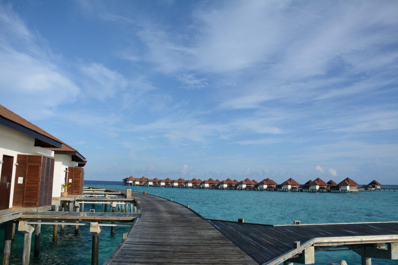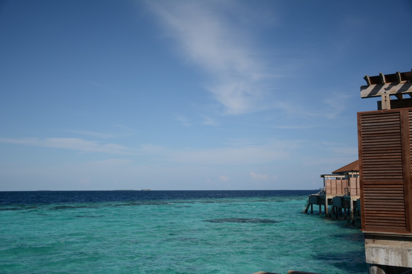 又经过了20多分钟的快艇,我们终于抵达了Robison,此时已经是马累时间5点,也就是北京时间8点了。有酒店的中文工作人员来接待我们并且介绍了酒店的相关事宜,然后带领我们去我们的房间。本来我们预定的房间是3晚花园洋房和2晚泄湖别墅,通知我们被升级到5晚水上泳池别墅,要不要这么幸运呢!!! 回到房间马上被眼前海水的颜色吸引住了,由近及远的绿松石色、褐色和深蓝侧的海水,不同颜色海水界限那么清晰,原来“面朝大海,春暖花开”是一种心境。旅途的疲顿被一扫而光,DR.WANG忍不住纵身一跃跳进了游泳池里。