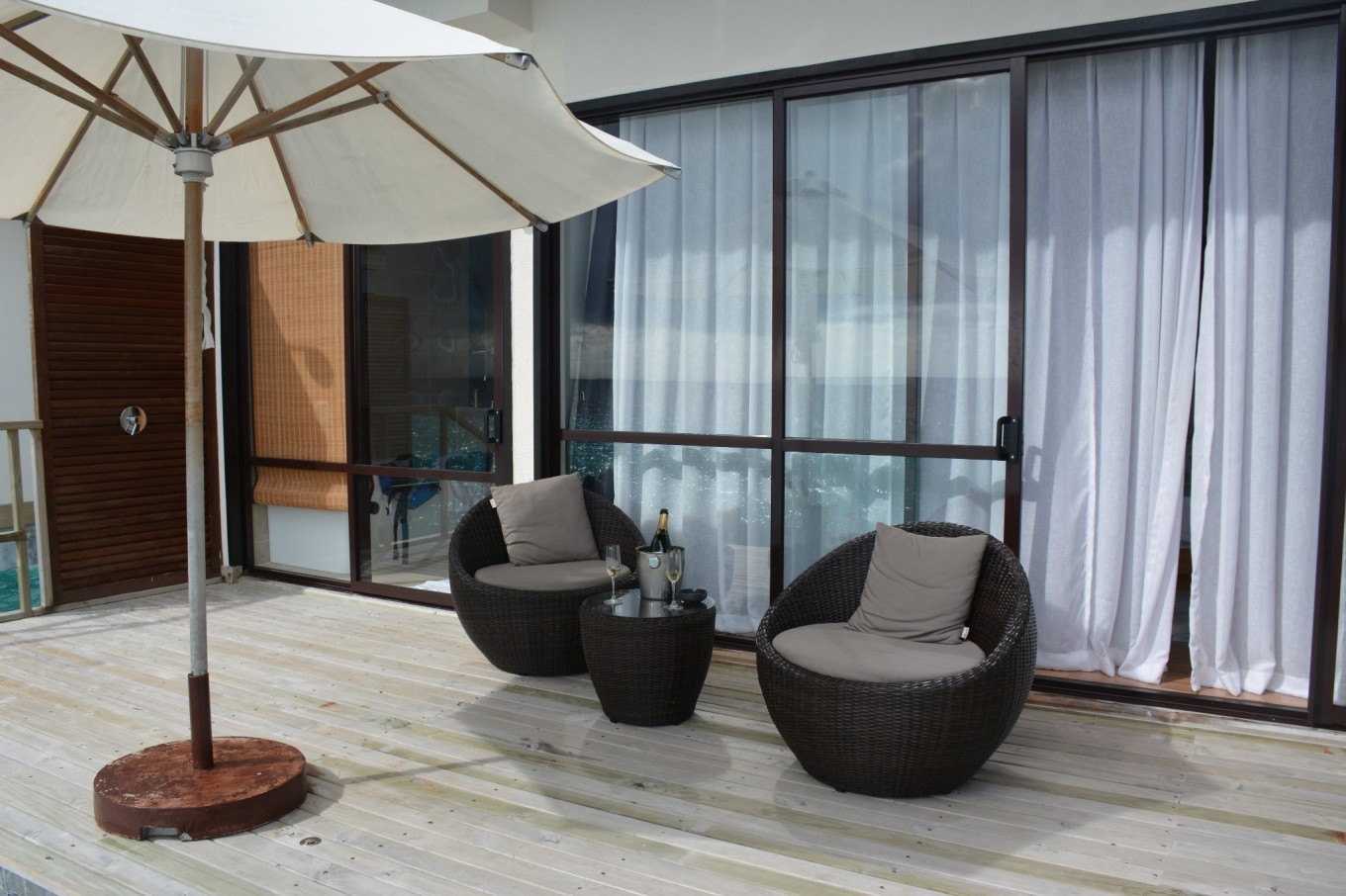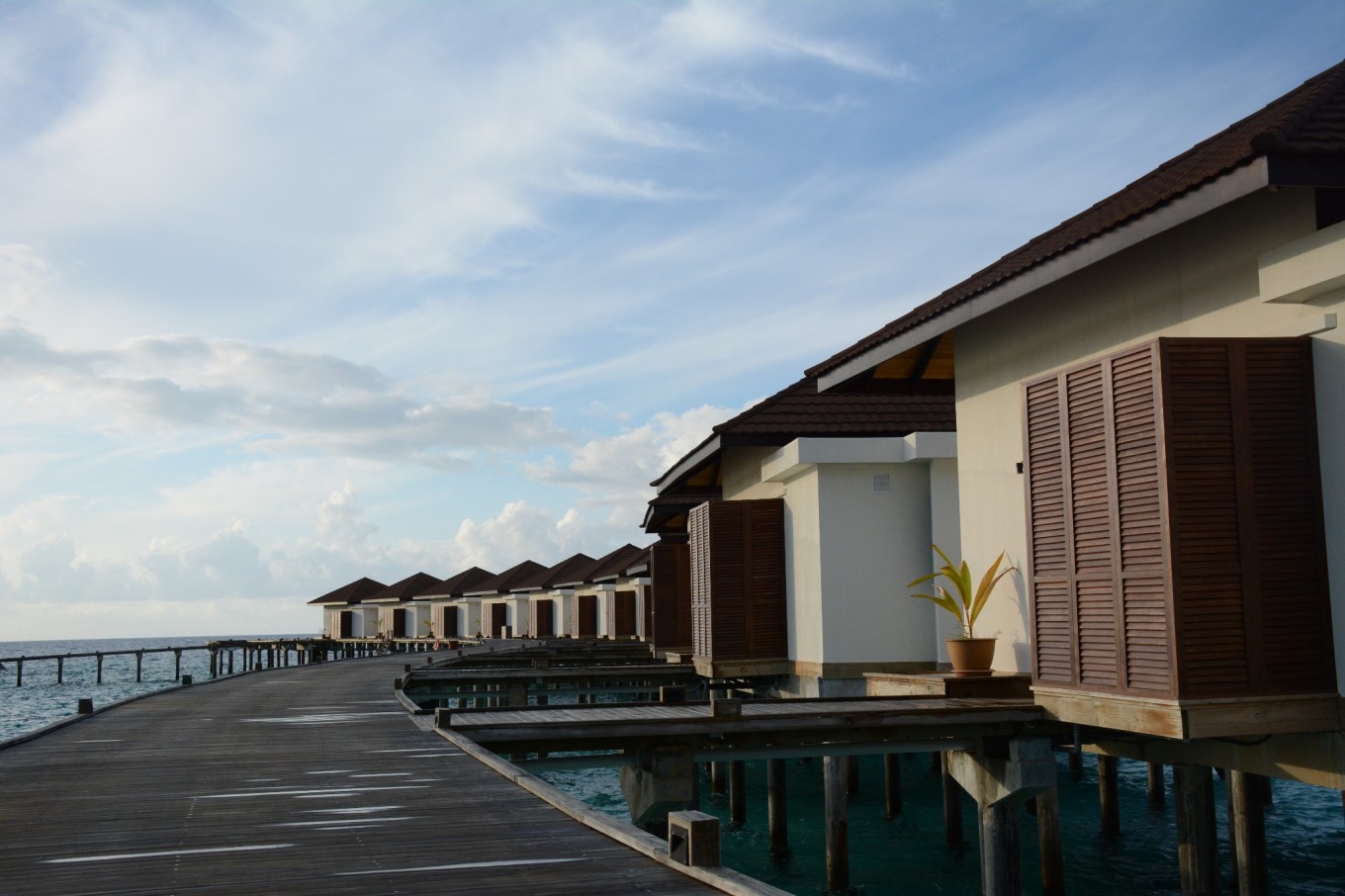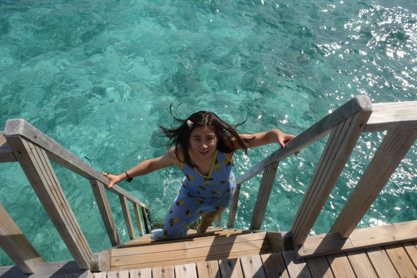 又经过了20多分钟的快艇,我们终于抵达了Robison,此时已经是马累时间5点,也就是北京时间8点了。有酒店的中文工作人员来接待我们并且介绍了酒店的相关事宜,然后带领我们去我们的房间。本来我们预定的房间是3晚花园洋房和2晚泄湖别墅,通知我们被升级到5晚水上泳池别墅,要不要这么幸运呢!!! 回到房间马上被眼前海水的颜色吸引住了,由近及远的绿松石色、褐色和深蓝侧的海水,不同颜色海水界限那么清晰,原来“面朝大海,春暖花开”是一种心境。旅途的疲顿被一扫而光,DR.WANG忍不住纵身一跃跳进了游泳池里。