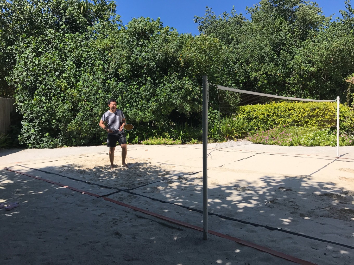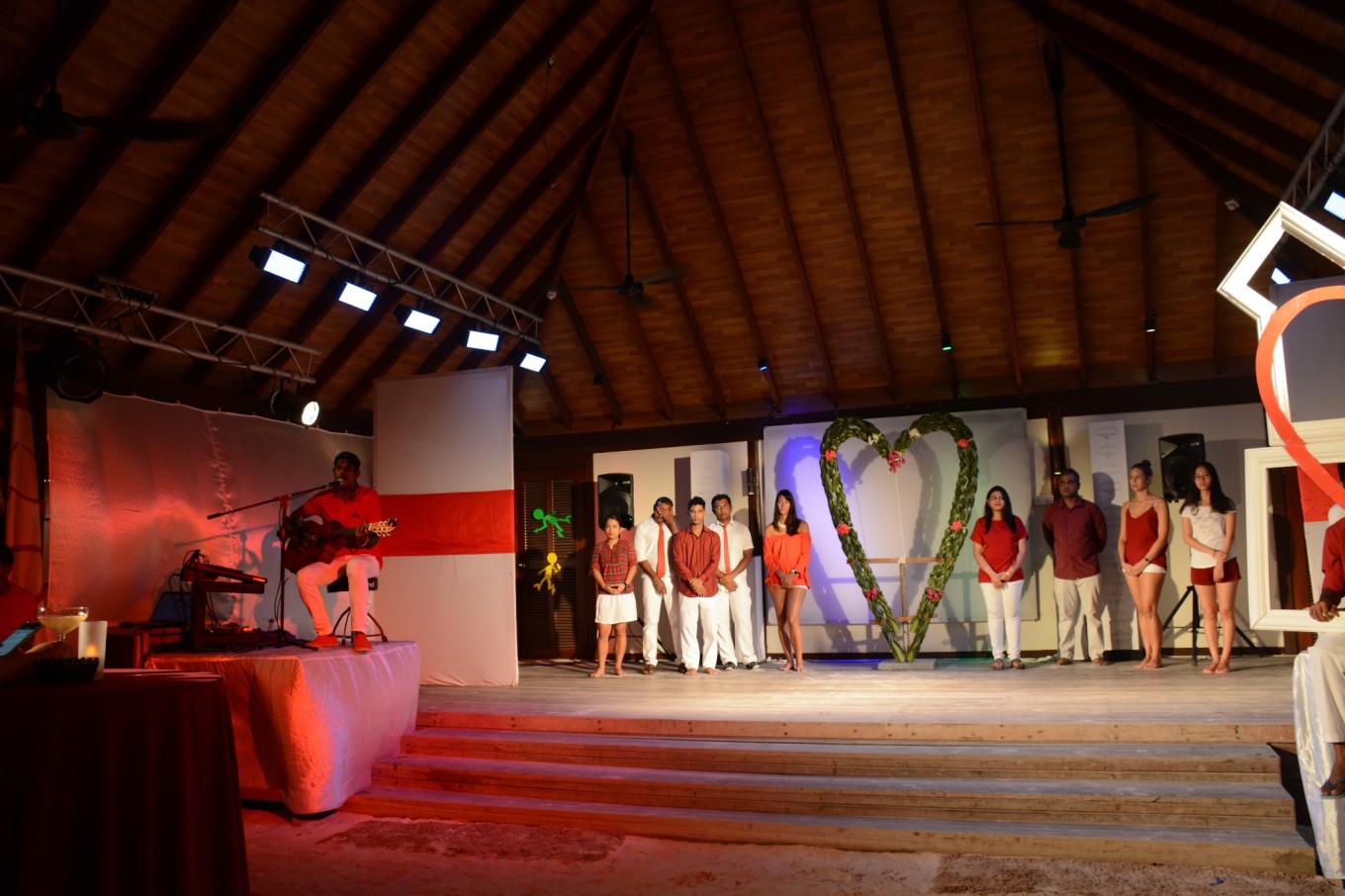 接下来的日子就变得规律无比,基本上维持在吃饭-睡觉-浮潜,吃了晚饭就会去主酒吧参加一下活动。一个活动是罗宾逊岛的介绍,前面会有一个超级可爱的宣传片和歌曲,告诉大家不要伤害鱼类和珊瑚,还有马代 、酒店和鱼类的相关介绍,介绍是用德语,但是PPT会有德语、英语和中文三种语言,也不怕看不懂。还有一个活动是“红白”派队,酒店工作人员也会穿上红色和白色的衣服,为大家表演献上一段30分钟的表演。还打了一次沙滩羽毛球,结果证明根本跑不动。