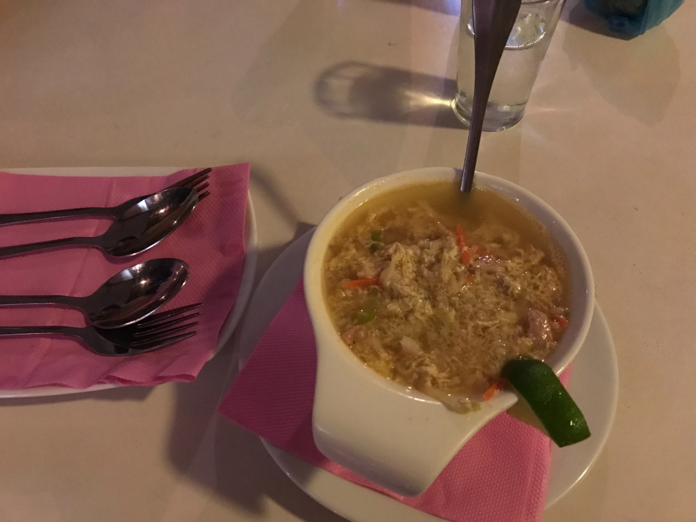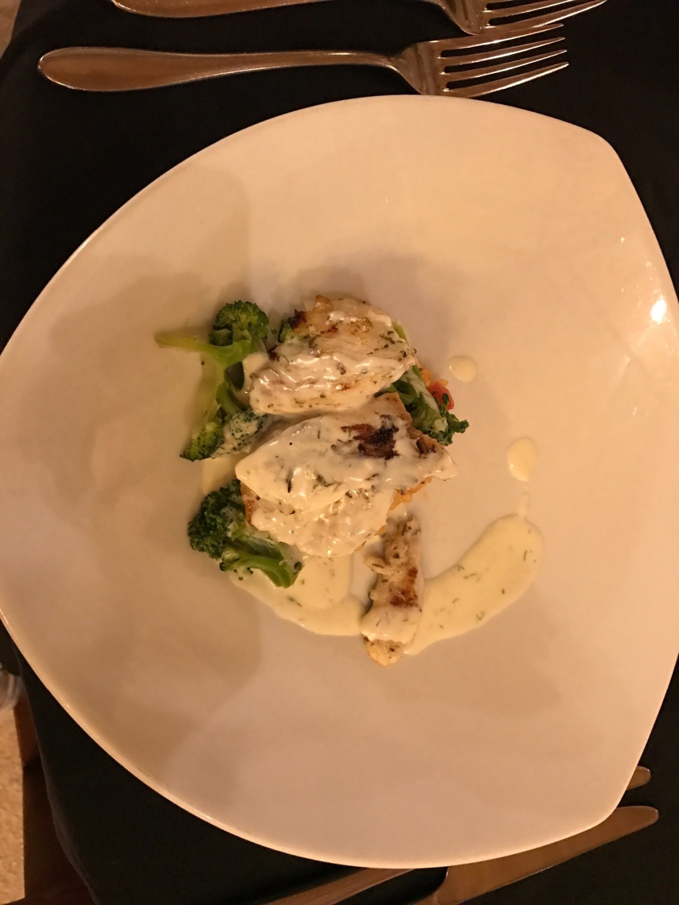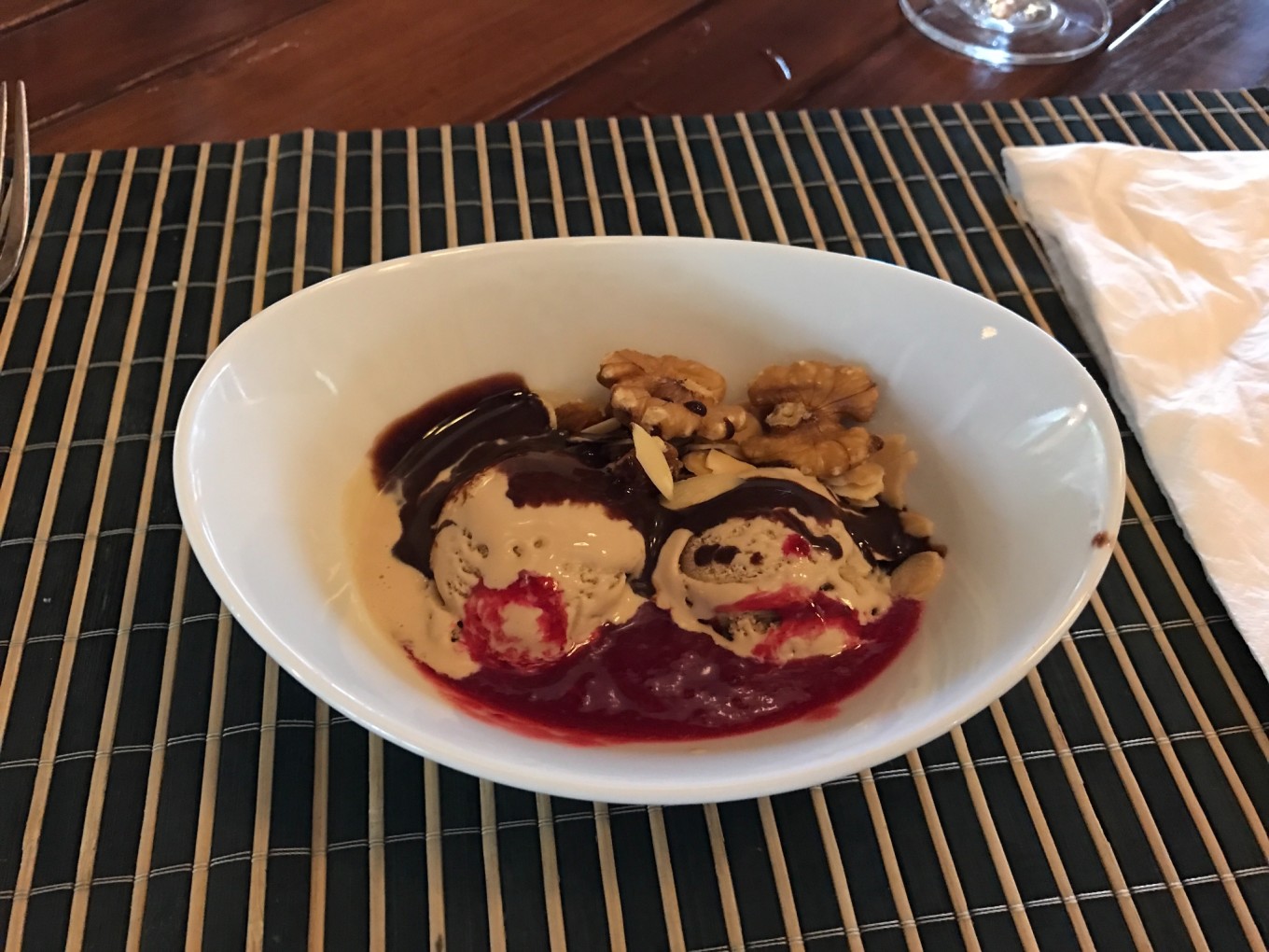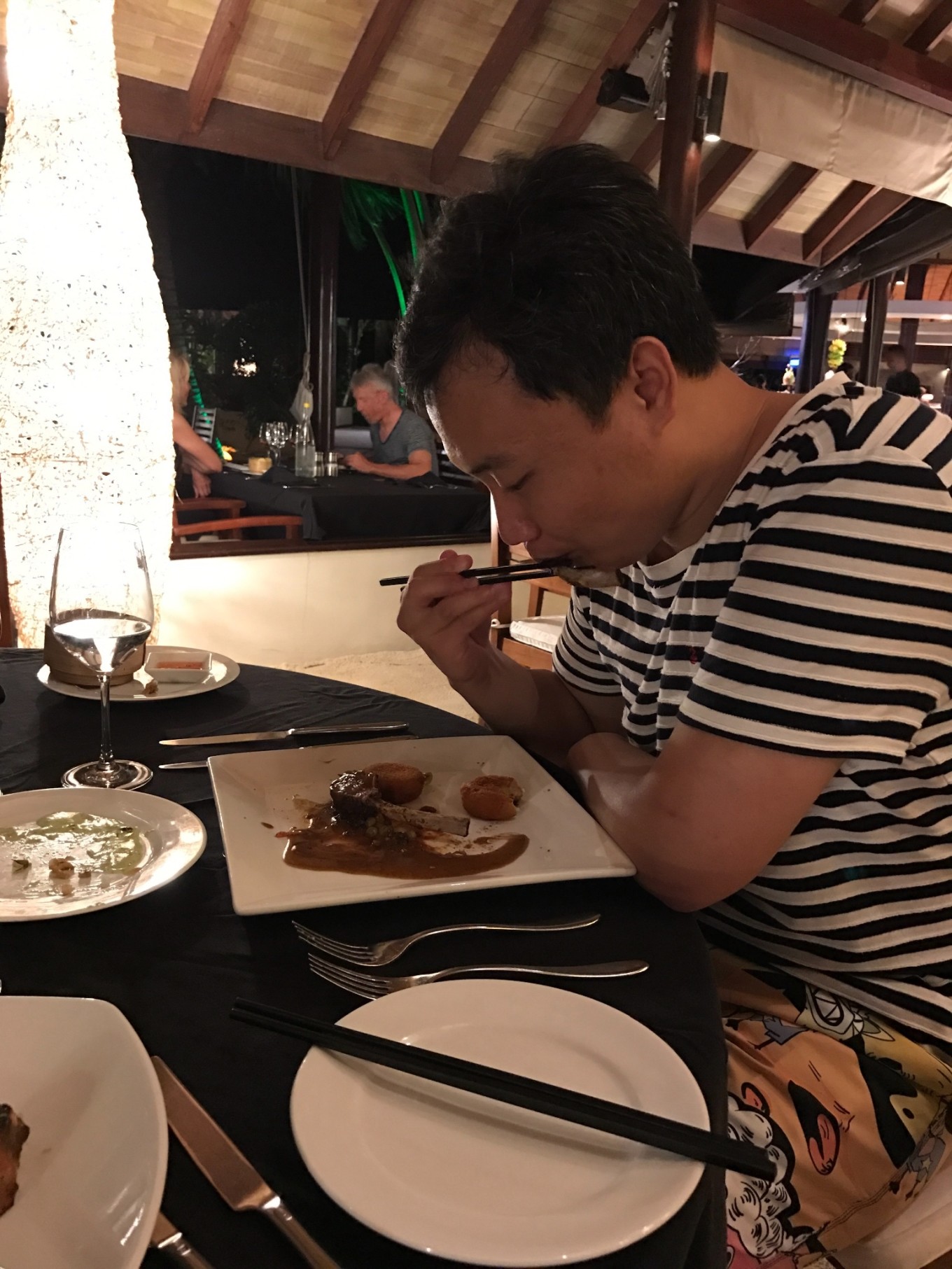 修整一下后,早早的就去吃晚餐了,服务生会给你倒上冰水,问你还需要什么其他喝的,我们要了两杯红酒,开始我们的第一餐。这种烂漫有静谧的氛围并没有维持多久,DR.WANG就拿起了筷子。