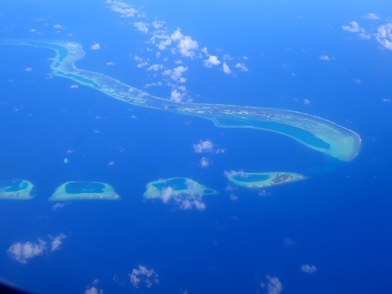 由于天气比较好,在内飞上也可以清楚的看到下面一个个环礁,形容为“散落在大西洋上的珍珠”一点都不为过,当然我也没有其他更多的词汇量来形容。