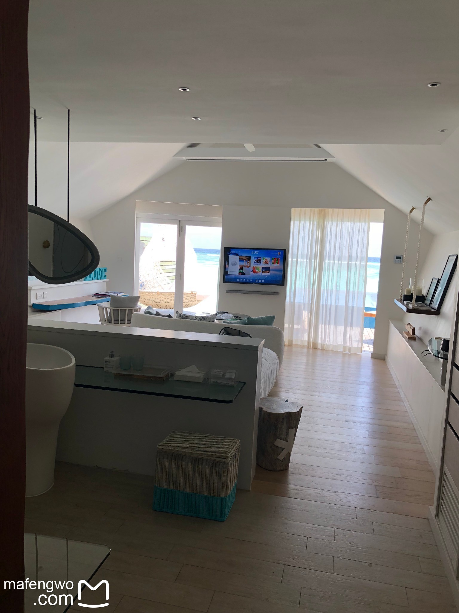 飞行时间大概40分钟抵达LUX。 因为害怕沙屋树林昆虫和壁虎比较多,我和老公选择了4晚水屋,还要告诉小伙伴们,马代每天早上都会喷药灭蚊、蚊子很少,几乎没有。所以并不像其他海边蚊子很多,我们还带了蚊香都没有用上。 我们的水屋是101,是最远的一间房,起初我和老公都比较困扰,在路上花费的时间很长,还好我们的管家帮我们租了自行车,方便很多,是免费的所以不用担心。房间真的可以满足一切对海滨,地中海风情的幻想。多的不说直接上图!