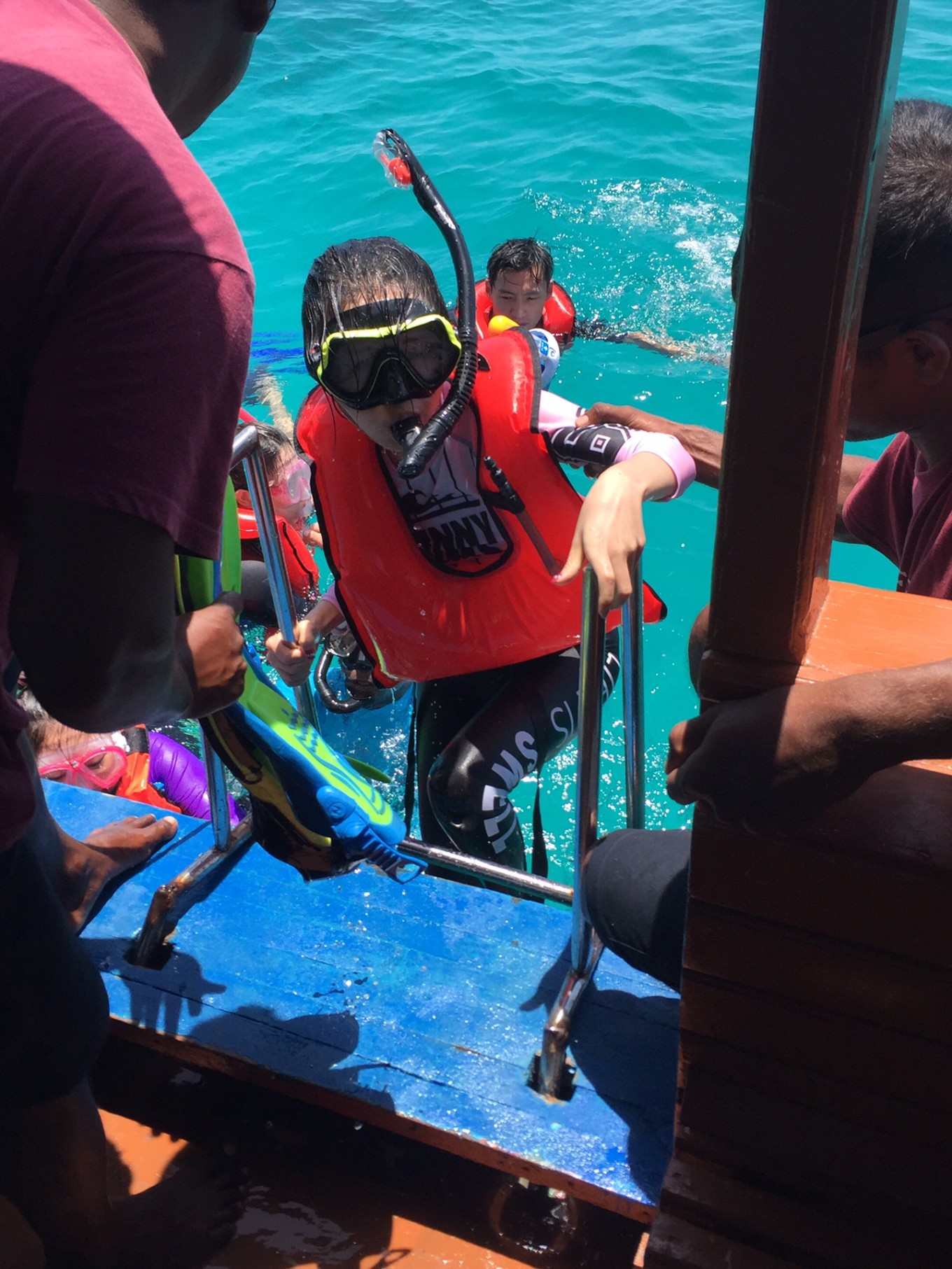 去浮潜记得带上浴巾,刚从水里上来会冷,有浴巾比较好,不过我都没有带,忘记啦,每次都是用的时候才想到 哈哈哈 还有 可以穿房间里的救生衣,会比船上简易的好,但是我是个怕麻烦的人,我就穿船上简易的啦