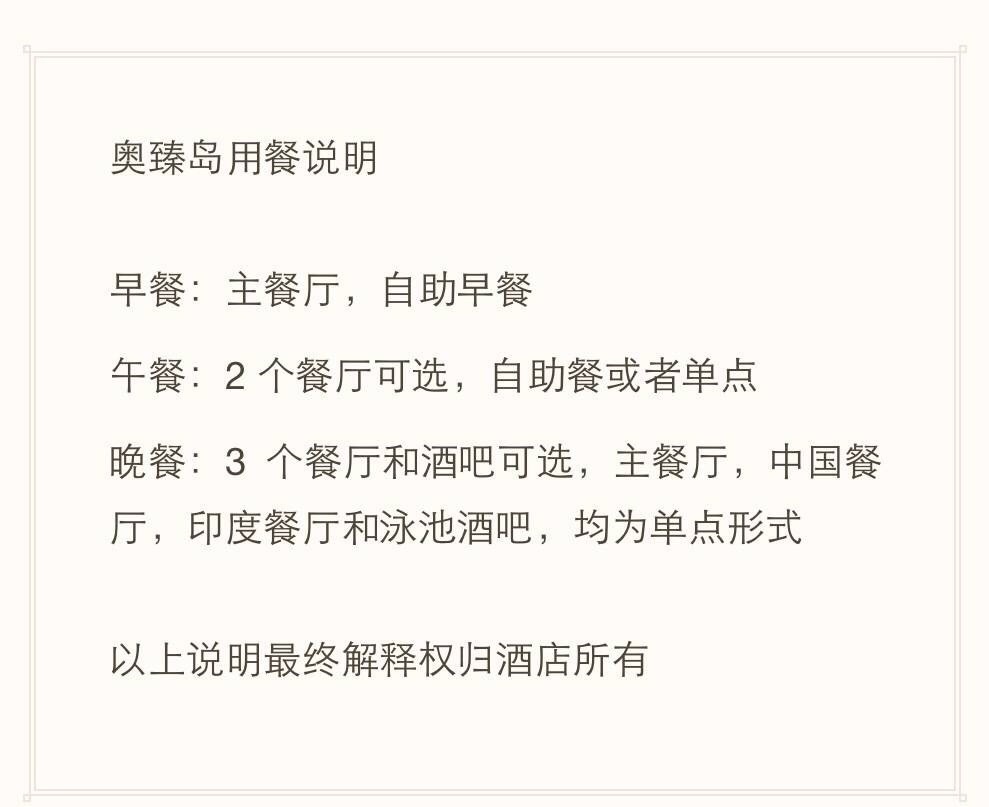 上岛后管家会安排中文服务沟通进行预约餐厅以及一些岛上的出海活动,告诉我们14:00才能拿房间房卡。(不知道现在还是不是)我是之前发邮件和酒店预约了餐厅以及活动,但是也有一点出入,具体要按照上岛后预约为主,所以大家要确认好。但是后来发邮件活动不接受预约,只能预约餐厅!不知道现在是不是连餐厅都要上岛约啦……不过,大家不用担心,都可以约到,只不过时间段问题……