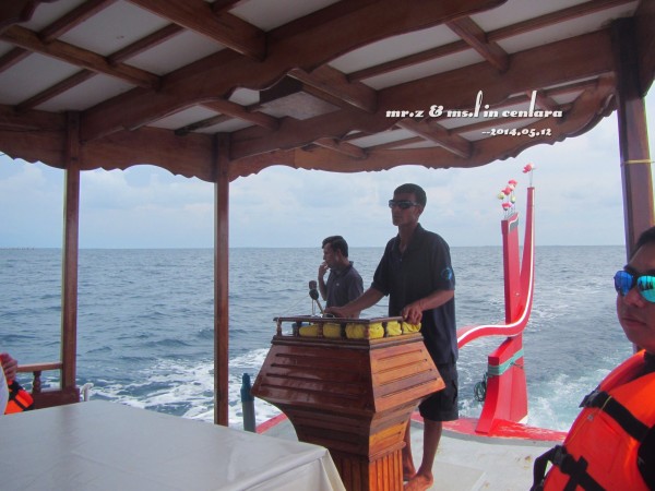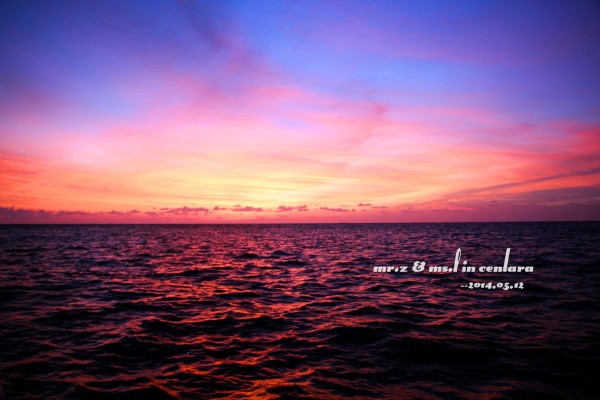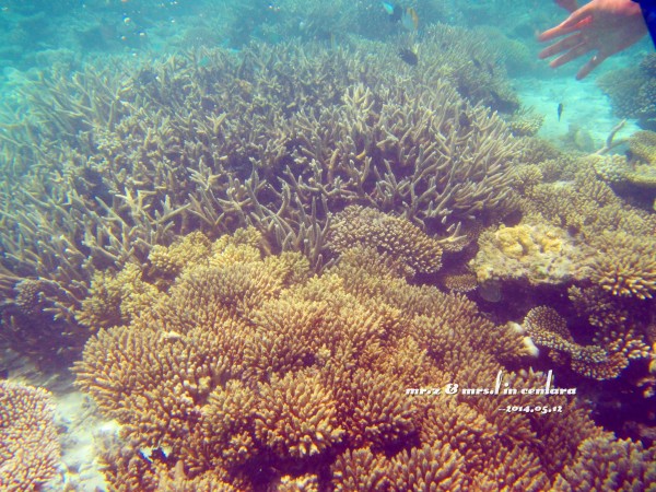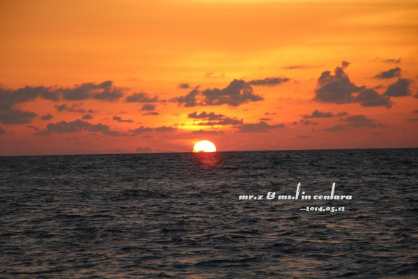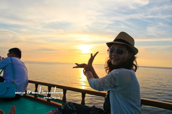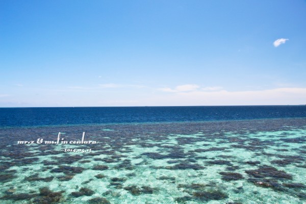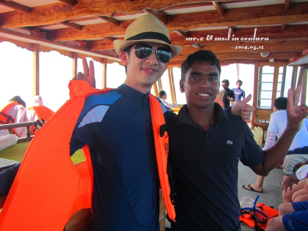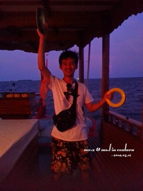 tips: 1、岛上的水上中心是有免费出租浮潜三宝(呼吸管、面罩和脚蹼)的,不过建议呼吸管还是自带的好,毕竟是要放进嘴巴里的东西,自带的卫生。每个房间的浴室里都有两件救生衣可以免费使用。 2、在租借浮潜用品的时候,小黑会要先测试你们的游泳水平,就是带上浮潜三宝和救生衣在水上中心门口来回游十米。即使不会游泳的同学也不用担心,小黑会耐心教的,最后肯定都会借得到浮潜三宝的。 3、岛上比较好的浮潜区域都在水屋的周边,沙屋附近的海里几乎是没有珊瑚的。早上的时间潮水还没涨起,水面较低,容易碰到珊瑚。傍晚的时间浮潜较好。 4、岛上是不提供救生绳的,需要的要自带。不过大家都反应救生绳不是很好用,而且容易缠上珊瑚,所以用不用看个人吧。 5、会不会游泳跟会不会浮潜真心是没关系的,因为有穿救生衣是不会沉下去的,只是不会游泳的人会觉得害怕而已。 洗漱完毕,换好衣服,我们就到码头报到,准备出发去巡航看日落~