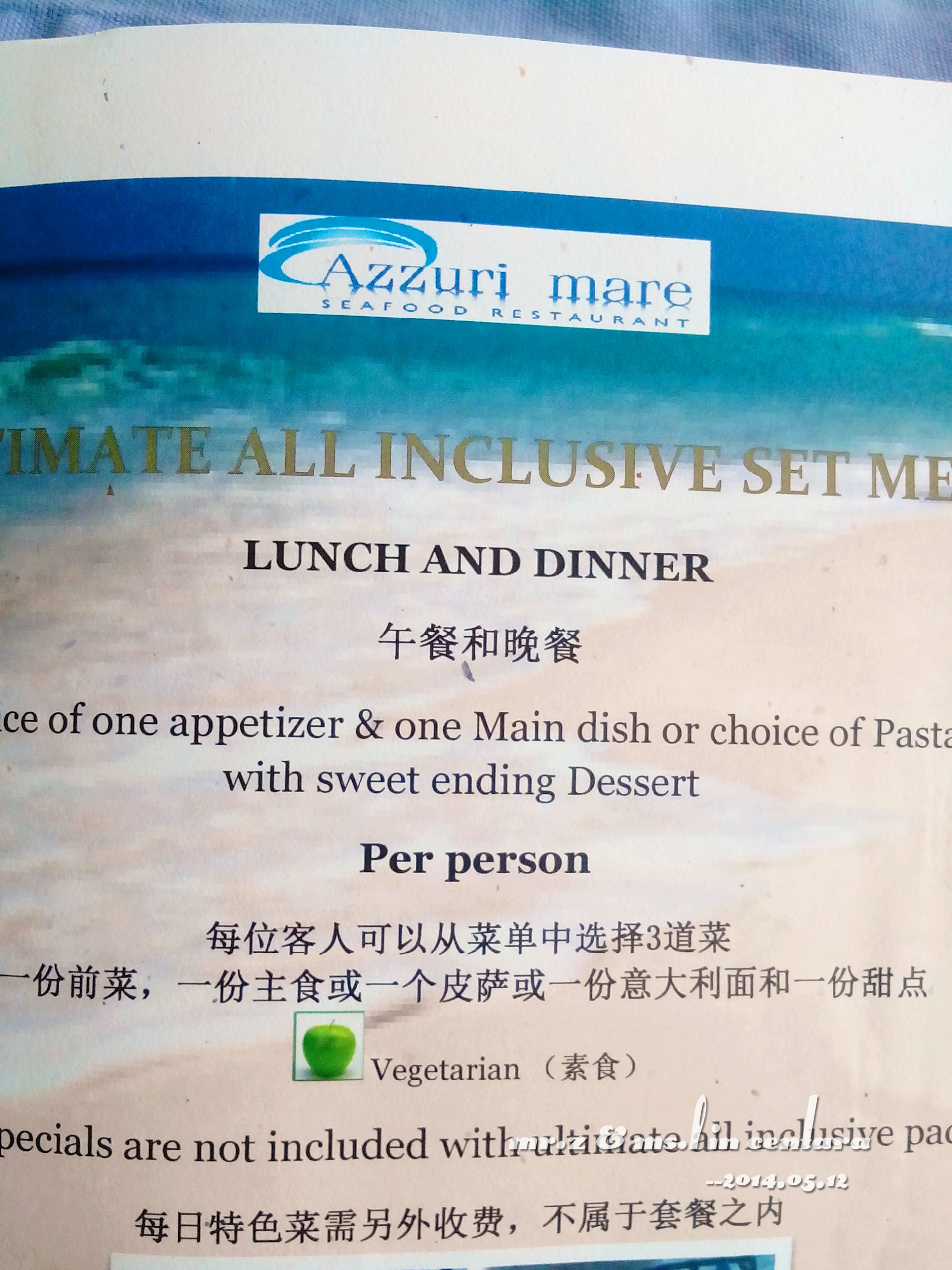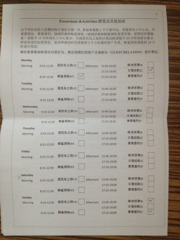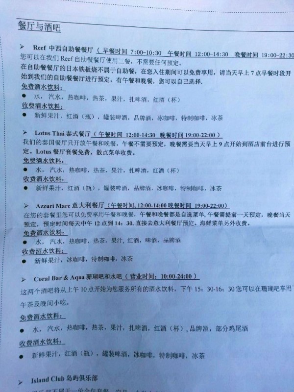 2、出机场后酒店的小黑会候在门口举着牌子(如果没看到自己酒店的小黑也可以询问其他酒店的小黑,他们都会热心告诉你的),出示完酒店确认单后,小黑会带你去托运行李,然后乘坐小巴去水飞机场,不过下车的时候要询问清楚小黑自己去的岛是不是这边下车,因为马累的水飞机场是有3个的。 3、进水飞候机室后也会有小黑引导,不过人多的时候一定要竖着耳朵听小黑有没有叫自己,不要只顾着拍照了~ 水飞的等待时间一般在半小时左右。 4、中央岛有中文GO服务,一般上岛后都会在码头等候,带你们去办理入住手续,然后会告知各种需要注意的地方。 5、在办理入住手续时,是需要登记信用卡信息的(必须是本人的VISA或者百事达信用卡),如果没有信用卡的话,就需要交付200刀的押金,退房时再退回。而且信用卡在海外刷卡是默认无密码的,这个大家千万要注意了,要保管好自己的信用卡。 6、岛上的服务员有部分会一点的中文,如果英语不好的,可以下一个有道词典或者旅行翻译官的app,查好单词给小黑看,他们都会懂的,再不行就只好运用你那丰富的肢体语言了。。。 7、每个房间里面都有保险柜的,就在衣柜里面。 8、上岛后建议预订的顺序为:Spa>出海活动>餐厅,因为岛上每天都有赠送半小时的免费Spa,Spa是最难预约的,预约到才能做,所以先根据预约到的Spa时间再去规划自己的出海活动,最后再去预约吃饭的餐厅和时间。Spa和餐厅都只是预约时间而已,具体要做什么项目、要吃什么都是到那边再订的。 9、免费 Spa 好像有五六个项目可以选的,一般都是两夫妻一个房间一起做,男的按男的,女的按女的。我做了肩颈和头部的,老婆做了身体香薰磨砂(这个项目是要脱光全身衣服的,但是技师会在你身上盖上毯子,用毯子盖着给你上磨砂,如果会介意的还是要慎选)。当然,如果你觉得半个小时不够的话,你也可以花上100多刀升级Spa,还有更多的可选项目。 10、岛上一价全包包括了5项出海活动:居民岛之旅、绿洲浮潜、鲸鲨探险、日落巡航和夕阳垂钓,每个活动都可以免费参加一次(据说居民岛之旅是最无聊的活动,就是去附近居民岛逛逛,买买纪念品之类的,不过适合带小孩的家庭)。出海活动都是要去外海的,风浪会比较大,很多不会坐船的人都晕船了,特别是女人跟小孩,所以可以带点晕车药或者风油精。如果想吐的话千万不要吐海里,及早示意小黑,小黑会给你一个桶的。。。