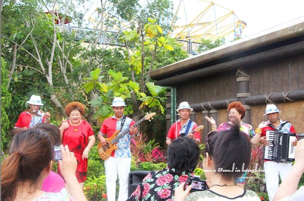 原来以为这是一个表演乐团,后来才发现中间那两个双胞胎胖阿姨只是游客。。。实在是太和谐了 到了傍晚六点钟,广播已经开始通知山顶上的动感天地快要关门了,让游客们准备下山。由于山顶的游乐场和山底的营业时间是不同的,想着山底还有几个场馆我们还没去,于是就乘坐海洋列车下山了。(建议缆车和海洋列车都体验下)
