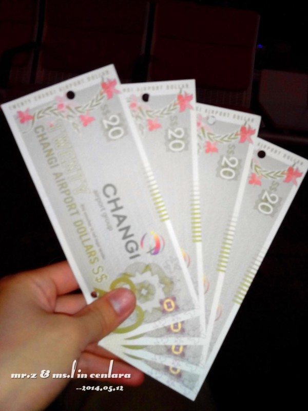 传说中的代金券~ 到了樟宜机场已经是凌晨的5点多了,由于前天在火车上没睡觉,在飞机上我倒睡得出奇的好,老婆由于紧张,都没怎么睡,所以到机场后虽然很多免税店都开着,可是老婆也没什么心情逛了。。我们去mcm背后的柜台领了每人40新币的代金券后,便去麦当劳随便吃了点早餐,代金券挺好用的,但是不找零啊,那个坑爹的服务员硬让我点了20新币的早餐啊。。。