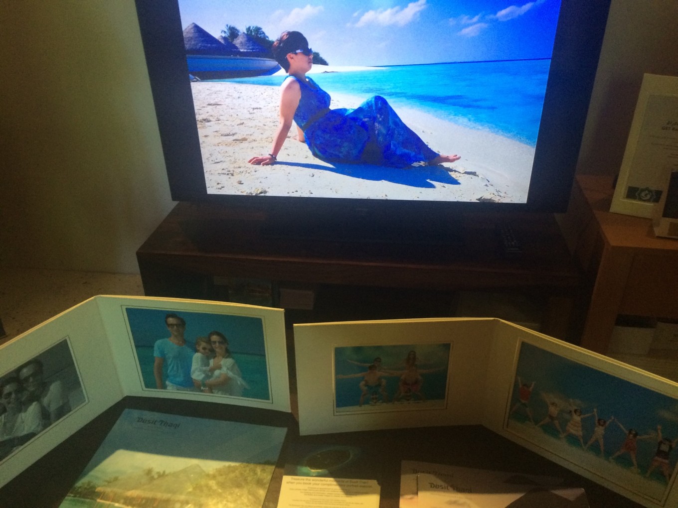 dusit thani 现在有一个活动,可以在岛上任何地方,摄影师帮你们拍照片30分钟, 拍摄完了之后,会有一张照片是免费的。 如果想要其他的照片。会收费的。 我们看了一下价目表,如果单是要照片,不做成相册的话,价格还是可以接受的。 为了达到宣传的效果,摄影师也帮我们去拍了一张的,我们是在water villa with pool 的泳池旁边拍的,实时证明。摄影师确实是摄影师,加上好的相机,确实照片出来的会漂亮一些, 不过没有给我们电子档,我们第二天离岛的时候,打印好的照片 管家帮我们送过来了。 很贴心的。