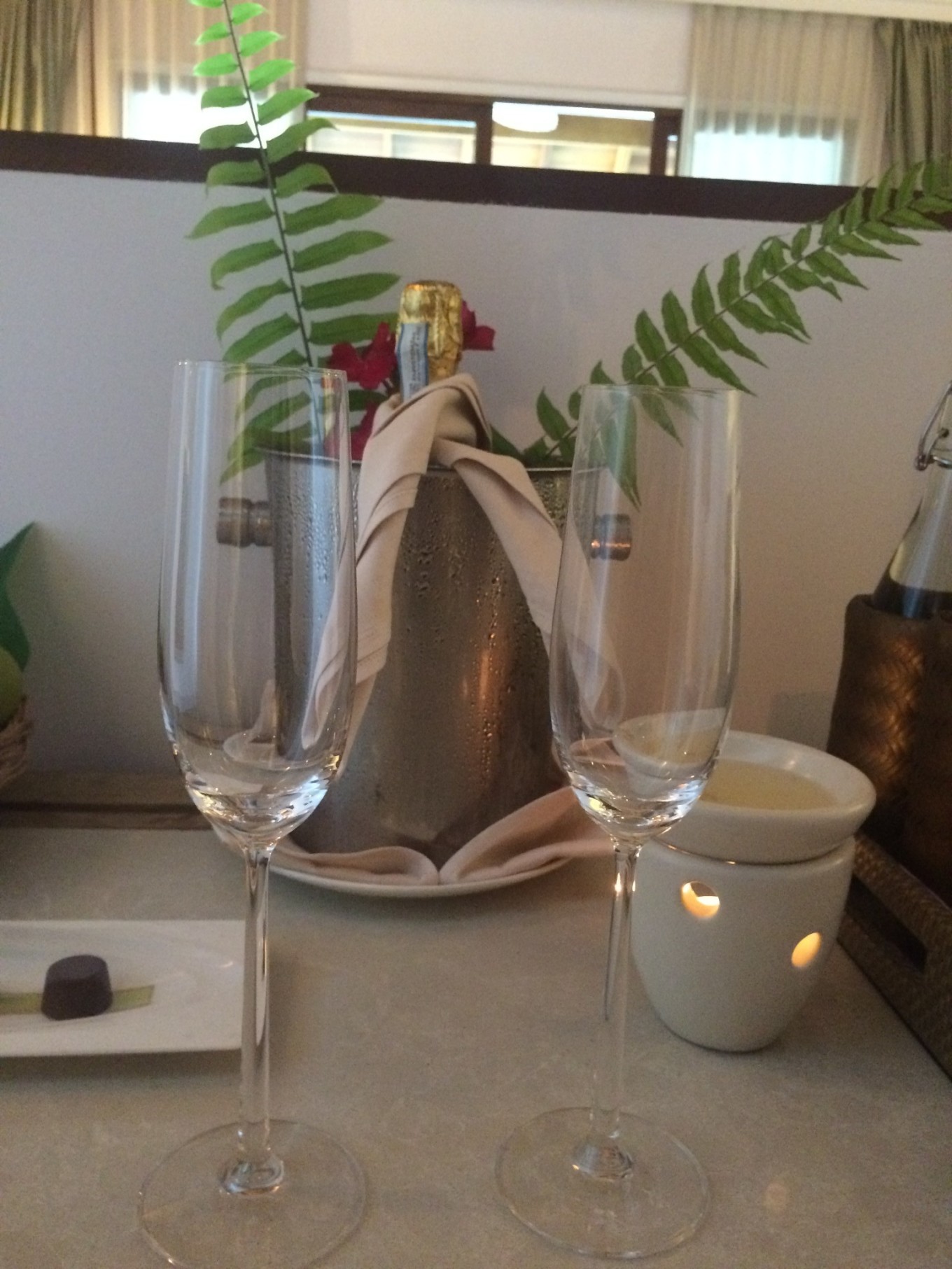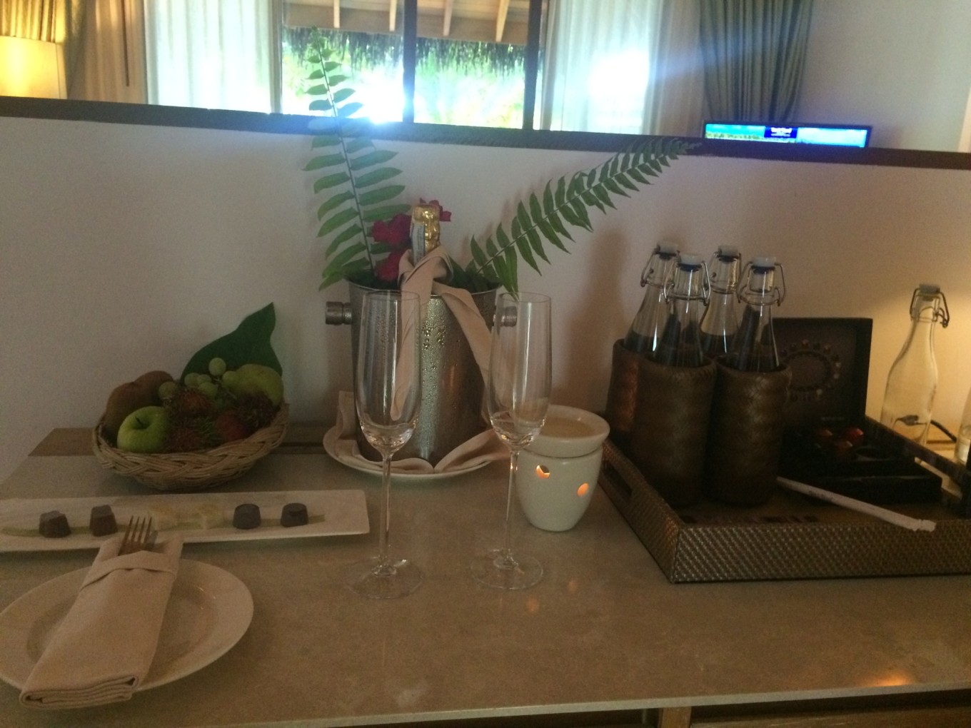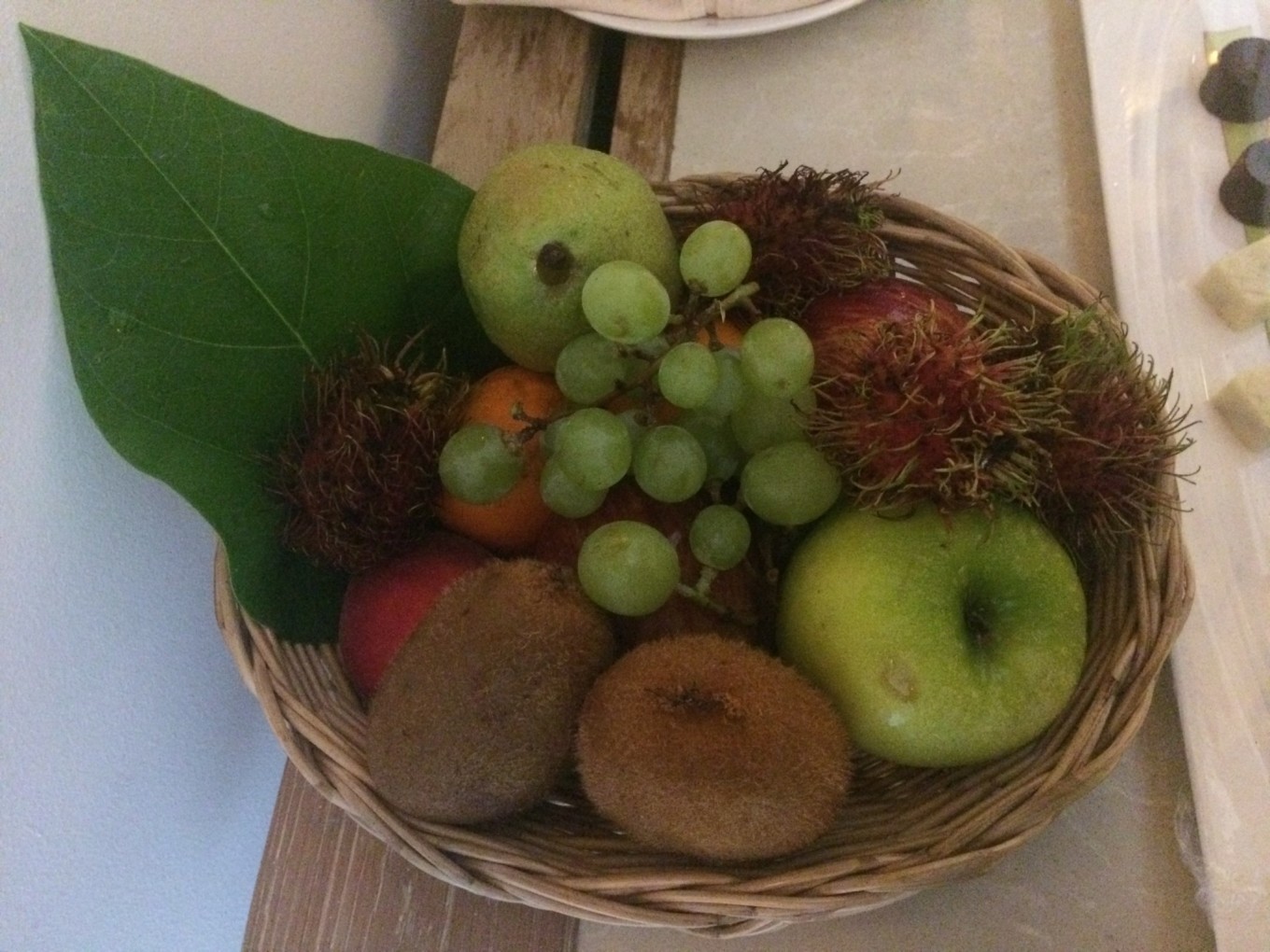 依旧给我们标配了。巧克力,香槟 ,还有水果,表示就是水果 巧克力都是吃的。香槟几个酒店都送了,我们没有开啊,长这么大,真的不会喝酒。到哪里点饮料都是,不含酒精。谢谢。