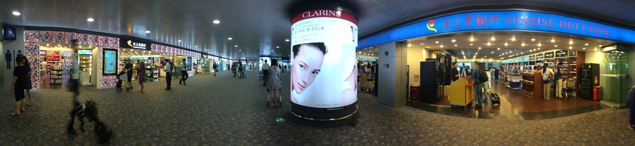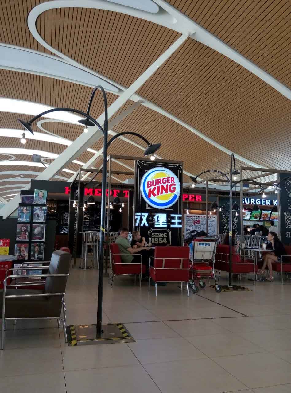 接下来的步骤就是: 在柜台排队换好登机牌,托运好了行李之后 直接找港澳台境外什么什么大厅 进去之后 排队出境。工作人员会在护照上面盖章 然后安检,安检之后就进入免税店啦。 之前不知道在哪个机场见到过,说是这个地方不能拍照,全程就手机都没有拿出来 由于早餐没有吃,进去免税店之后,我们第一站就地方吃东西 基本上是在小二楼的。 吃的汉堡王 棒棒哒