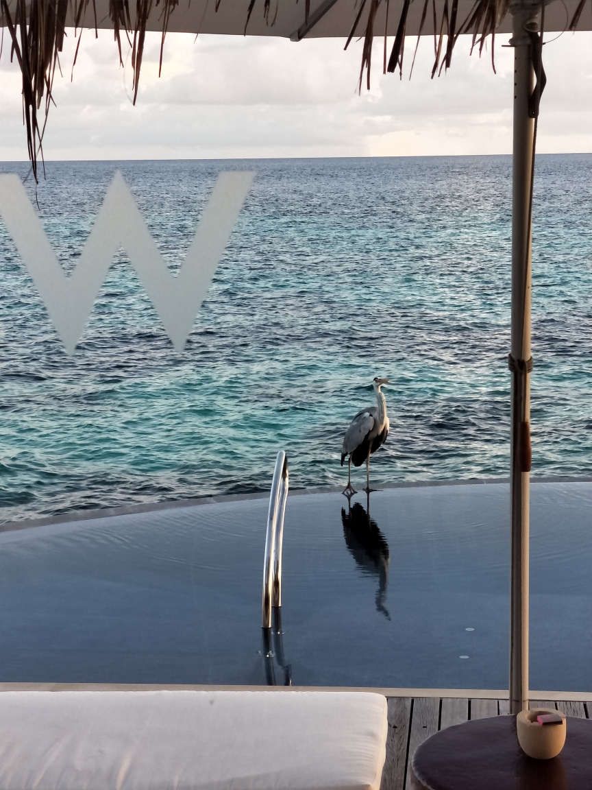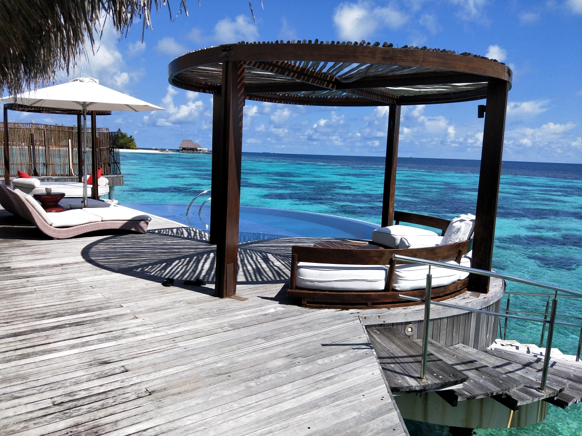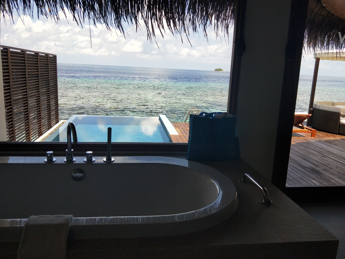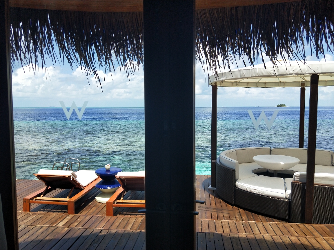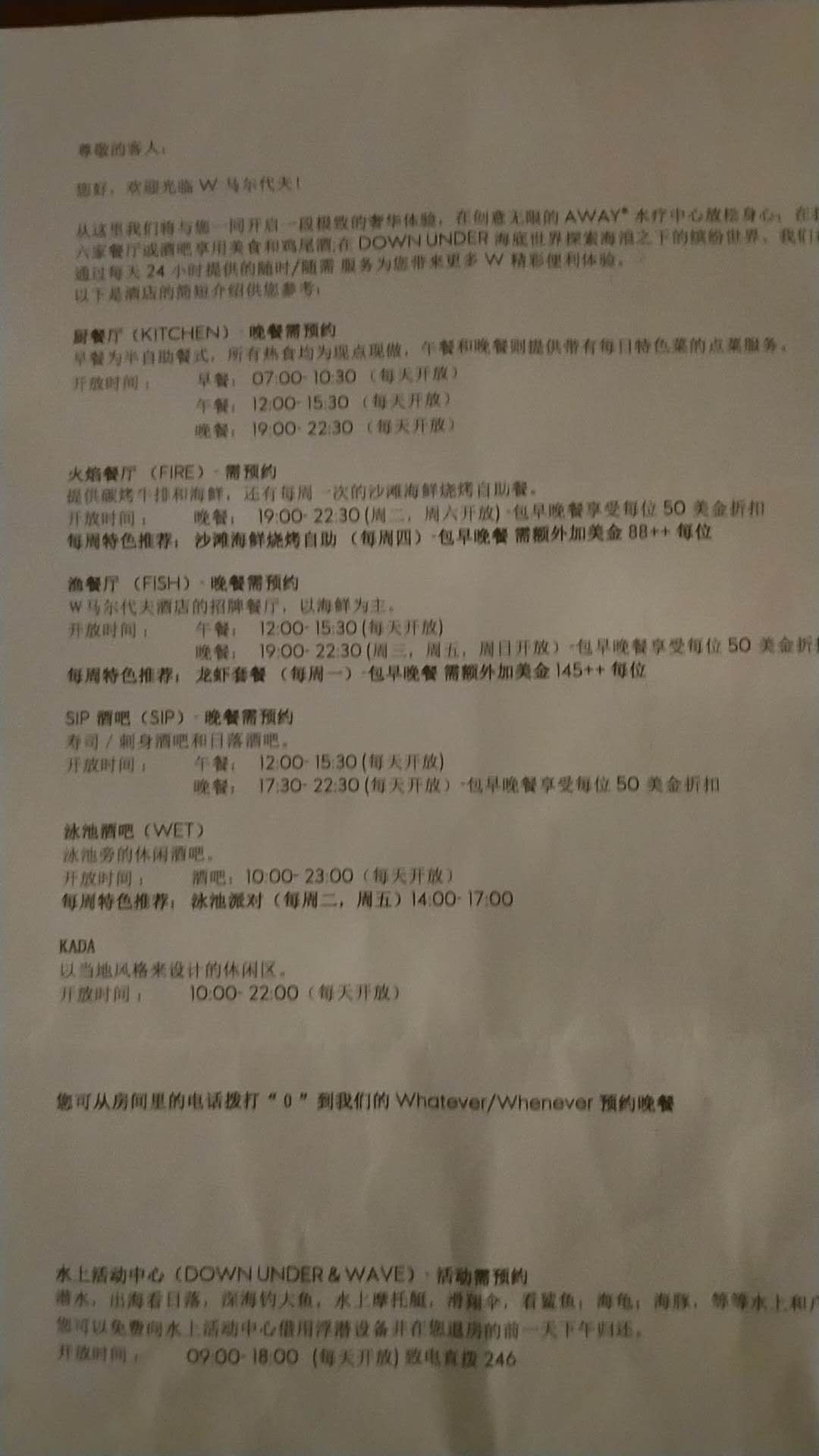 我在这里想说小伙伴们看见W出了打包价如果价格在你的心里范围之内不要犹豫下手吧,价格绝对合适啊!就算价格不是打包价只要预算够W是一定要考虑的!首先是双层大沙屋二楼阁楼吹海风看海景不要太爽有木有!并且带一个拍照利器私人泳池啊!水屋也带私人泳池,而且有临海圆床,圆形的玻璃直接看海里游过去的小鱼。再说岛上的补给站,虽然现在没有冰激凌了,但是有青苹果和水还有毛巾,青苹果其实比冰激凌好很多啊,晚上吃完饭散步后饿了拿一两个青苹果吃垫垫肚子= =会比冰激凌作用大 热了的话水是冰的完全可以降温~这是补给站 还有三个餐厅我强烈推荐fire的沙滩烧烤= =妈呀 美食太多,海鲜、水果、寿司、烤肉等等= =很多啊简直是美食一条街= =还有fire的海洋天堂 kitchen的印度风味配烤鸡= =美食太多 我缓缓 = = 浮潜是重点来了!如果喜欢浮潜和深潜,那你还在犹豫什么,这里fish到spa的浮潜一路能给你太多震撼 ,深潜更是专业 教练会给你先测试在下水我深潜还看到了一条鲨鱼!