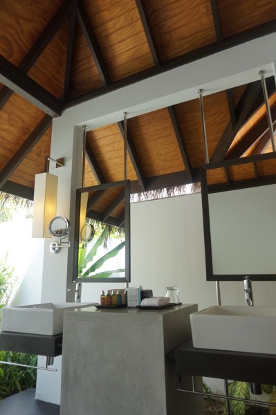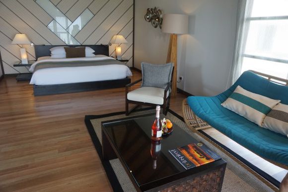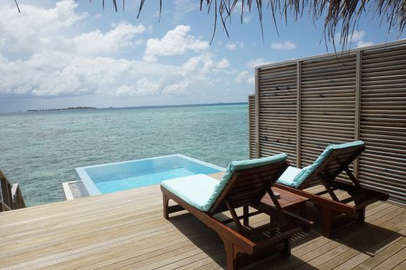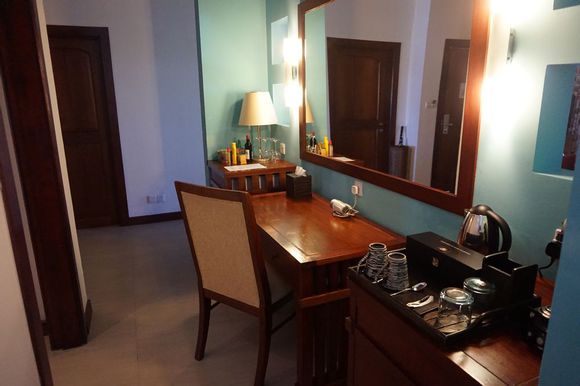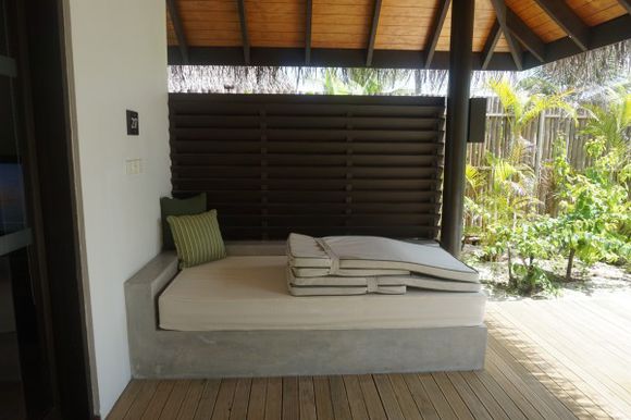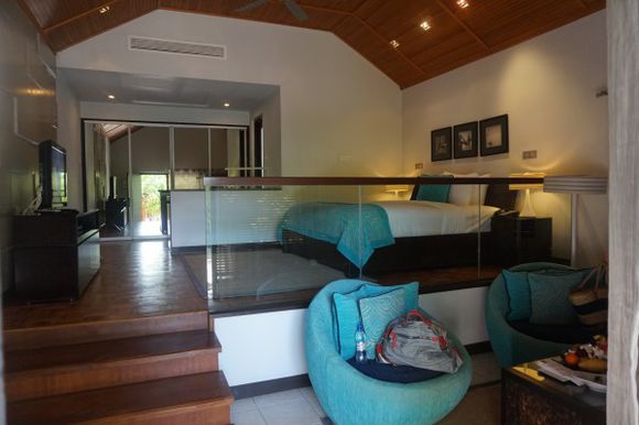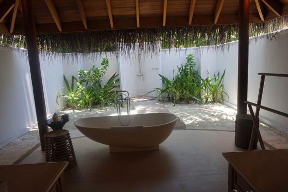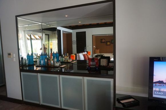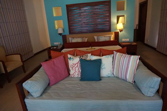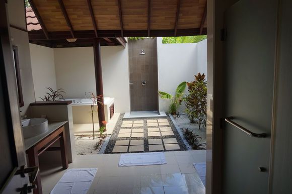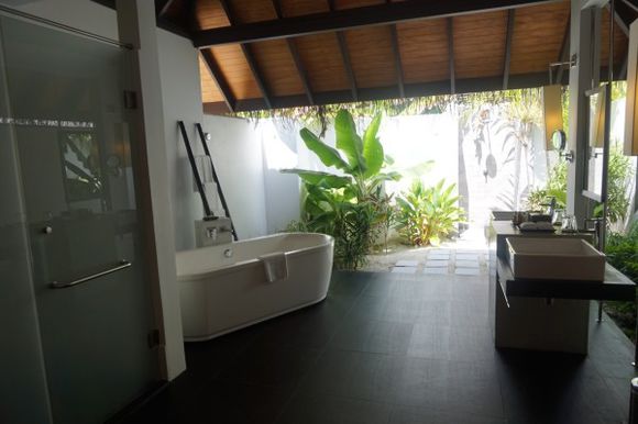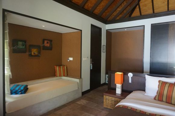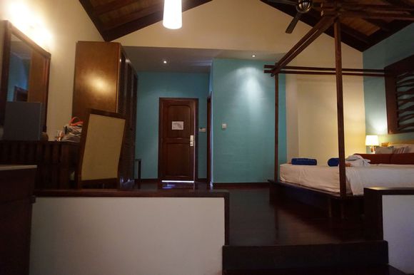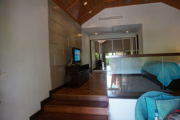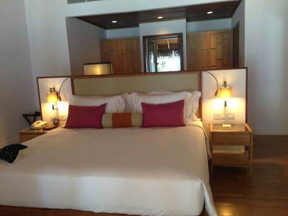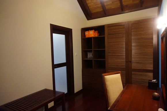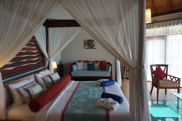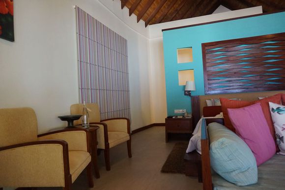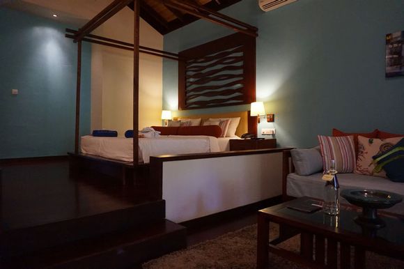 以上就是维拉沙鲁的餐饮了,下面来欣赏下维拉沙鲁的房间。很别致的,水屋有泳池的。我们住的是deluxe bungalow,我们的房间里面有小的按摩泳池的,晚上边看iPad,边坐在按摩浴缸里,特别舒服,按摩泳池好像只有3间的样子,靠近餐厅这边,私密性不是特别好的。别墅设施:带淋浴的室外浴室、室内淋浴间。室内设施:液晶电视和DVD播放机、迷你吧、茶叶和咖啡、国际长途直拨电话和互联网接入、iPod基座、浴袍和吹风机、独立控制的空调和吊扇、欧舒丹洗护用品。房间有2大瓶矿泉水的,还有烧水壶可以烧水的,茶包和咖啡都是免费的,有保险箱的,贵重物品可以放进里面的。迷你吧的酒水和饮料是收费的,上面都是有价目单的。还有冰箱的。